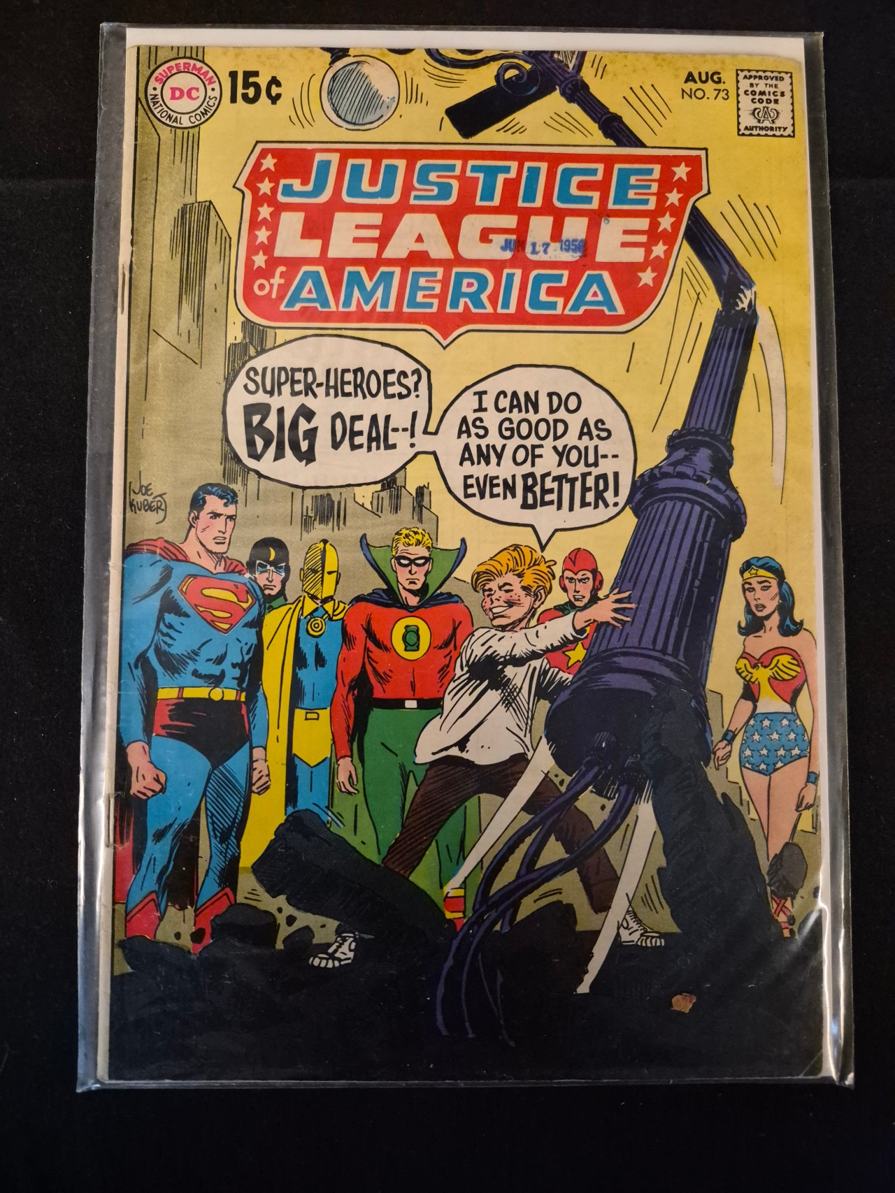 BID PER WHAT YOU SEE IN THE PHOTO, NOT THE AI GENERATED TITLES AND DESCRIPTIONS! This is a single issue of Justice League of America, No. 73, published by DC National Comics with a cover date of August 1969. The cover art is signed by Joe Kubert and depicts various superheroes including Superman, Wonder Woman, and Green Lantern observing a young character. This issue is noted for featuring the first Silver Age appearance of the Golden Age Black Canary. The publication includes a 15-cent cover price and the Comics Code Authority seal in the upper right corner. A blue ink date stamp reading JUN 17 1969 is applied over the main title. The comic is printed on paper and is housed in a clear protective sleeve.