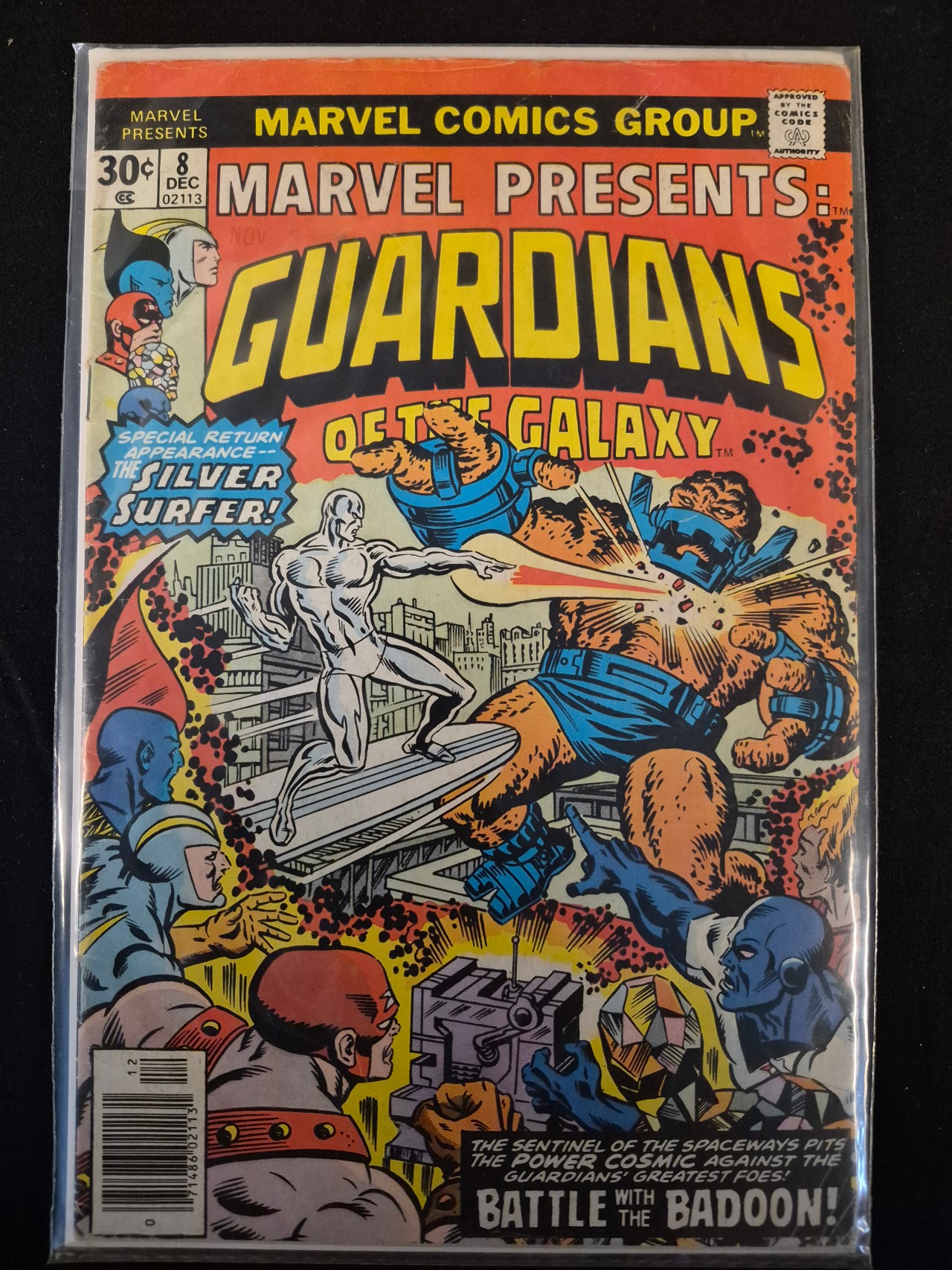 BID PER WHAT YOU SEE IN THE PHOTO, NOT THE AI GENERATED TITLES AND DESCRIPTIONS! This is an issue of Marvel Presents, number 8, published by the Marvel Comics Group in December 1976. The comic features the Guardians of the Galaxy and a guest appearance by the Silver Surfer in a battle against the Badoon. The cover art displays the title, a 30-cent price point, the Comics Code Authority seal, and a barcode in the lower-left corner. The publication is printed on standard comic stock. The item is presented in a clear protective plastic sleeve.