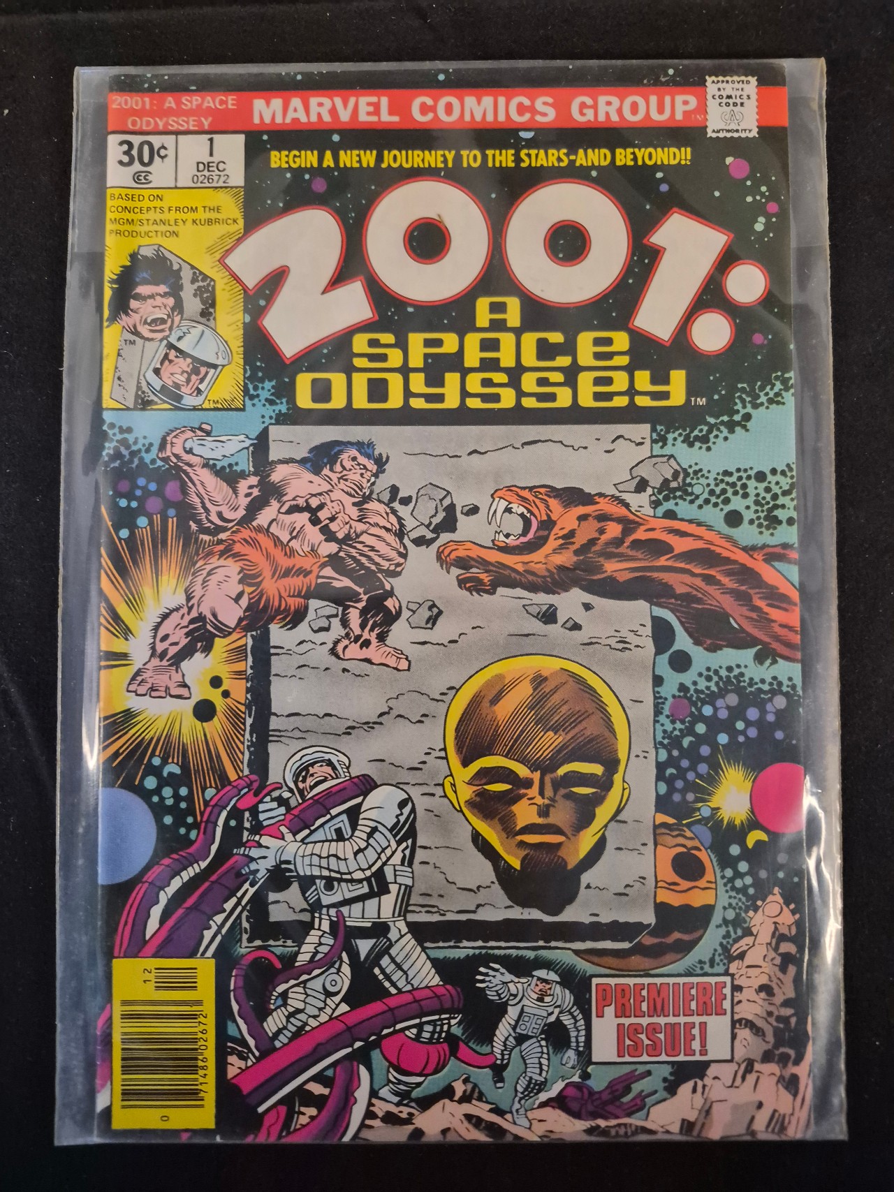 BID PER WHAT YOU SEE IN THE PHOTO, NOT THE AI GENERATED TITLES AND DESCRIPTIONS! This is a first-issue copy of Marvel Comics 2001: A Space Odyssey, dated December 1976. This Bronze Age comic book features artwork by Jack Kirby and is based on concepts from the MGM/Stanley Kubrick film production. The cover displays a 30-cent price point, the Premiere Issue! tagline, and the Comics Code Authority seal. The cover illustration depicts various prehistoric and science-fiction characters. A standard UPC barcode is visible in the lower-left corner.