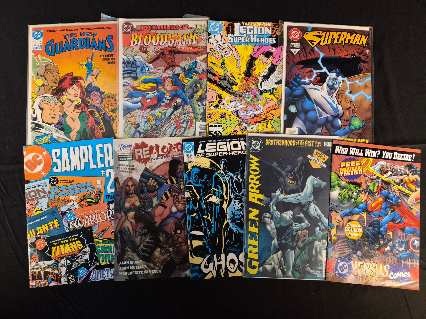 BID PER WHAT YOU SEE IN THE PHOTO, NOT THE AI GENERATED TITLES AND DESCRIPTIONS! A collection of American comic books primarily published by DC Comics during the late 20th century. The group features various superhero titles including The New Guardians issue 1, Blood Bath issue 1, Tales of the Legion of Super-Heroes issue 326, Superman issue 126, DC Sampler issue 2, Legion of Super-Heroes issue 59, and Green Arrow issue 134. Also included is a Versus preview issue and Interday’s Reload issue 1. The publications are printed on standard comic book paper with full-color covers. Most issues are housed in individual protective plastic sleeves with cardboard backing boards.