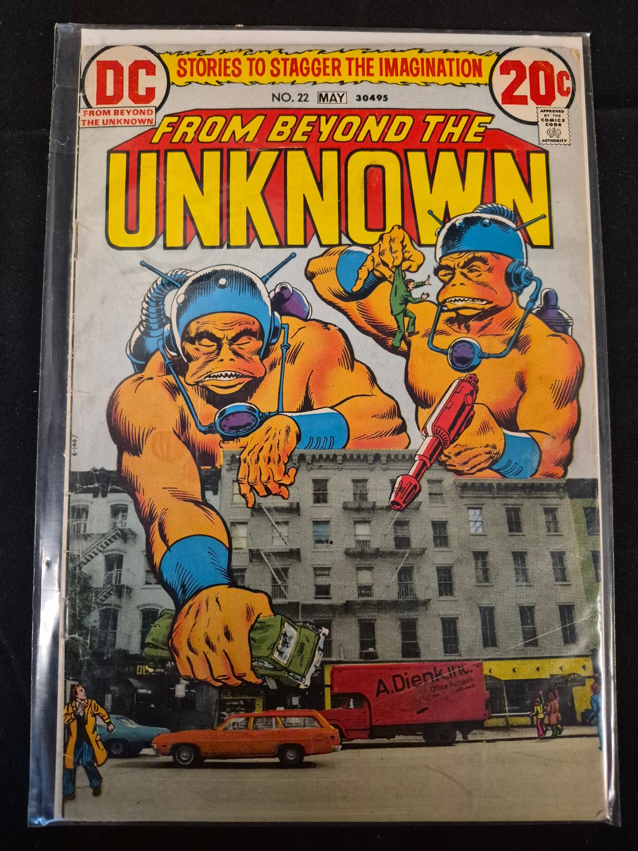 BID PER WHAT YOU SEE IN THE PHOTO, NOT THE AI GENERATED TITLES AND DESCRIPTIONS! A vintage DC comic book titled From Beyond the Unknown, issue number 22, published in May 1973. This Bronze Age publication features a 20-cent cover price and the Comics Code Authority seal. The cover art depicts two large, orange-skinned extraterrestrial figures in blue technological gear looming over a photographic depiction of a city street. One figure is shown crushing a green vehicle while the other holds a small human figure. The background features a photographic image of a multi-story building and a red delivery truck. The title is rendered in yellow lettering with a red outline.