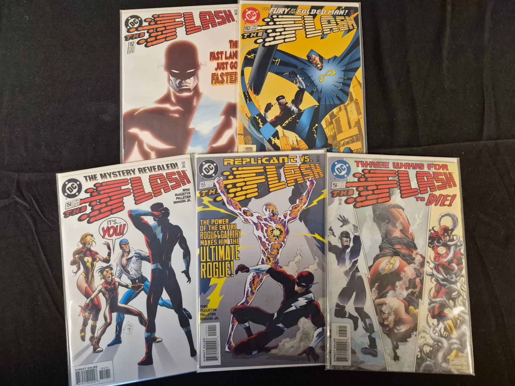 BID PER WHAT YOU SEE IN THE PHOTO, NOT THE AI GENERATED TITLES AND DESCRIPTIONS! A group of modern age comic books from the DC Comics series The Flash (Vol. 2), including issues 152, 153, 154, 155, and 156. Published circa 1999 to 2000, these issues feature creative credits for Mark Waid, Brian Augustyn, Paul Pelletier, and Jose Marzan Jr. The collection includes issue 155, which features the character Replicant. Each comic is a direct sales edition with a barcode present on the front cover. The covers are illustrated with color superhero graphics and include story titles such as The Fury of the Folded Man! and Three Ways for the Flash to Die! The items are printed on standard comic paper stock and are individually housed in clear protective plastic sleeves.