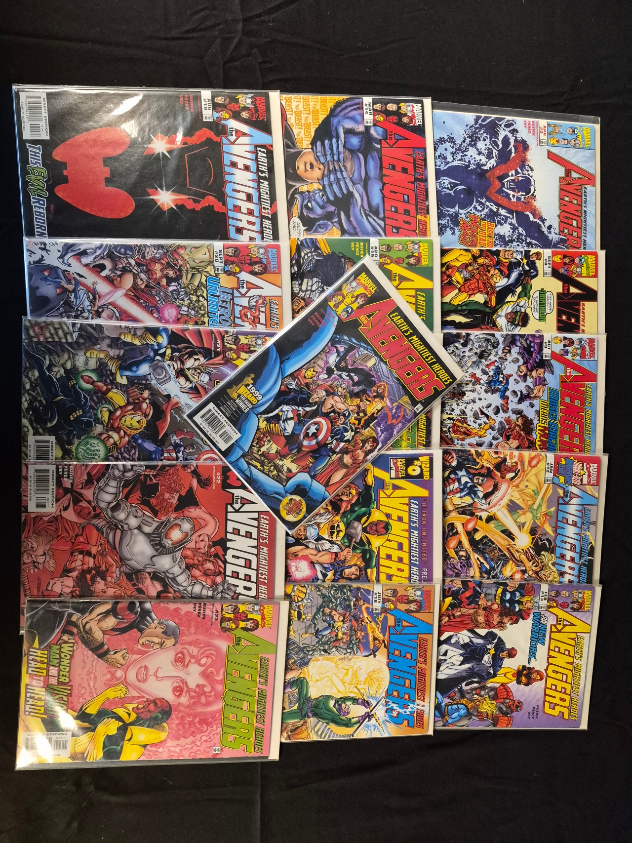 BID PER WHAT YOU SEE IN THE PHOTO, NOT THE AI GENERATED TITLES AND DESCRIPTIONS! This collection consists of several comic books from the Marvel series The Avengers Vol. 3, subtitled Earth’s Mightiest Heroes. The issues date from the late 1990s and include numbers 0, 8, 9, 12, 14, 15, 18, 19, 20, 21, 22, and 23. Creative contributions identified on the covers include Kurt Busiek, George Pérez, and Al Vey. One issue features a 1999 Wizard Fan Award Winner seal on the front cover. Each comic is individually housed in a protective plastic sleeve with a backing board.