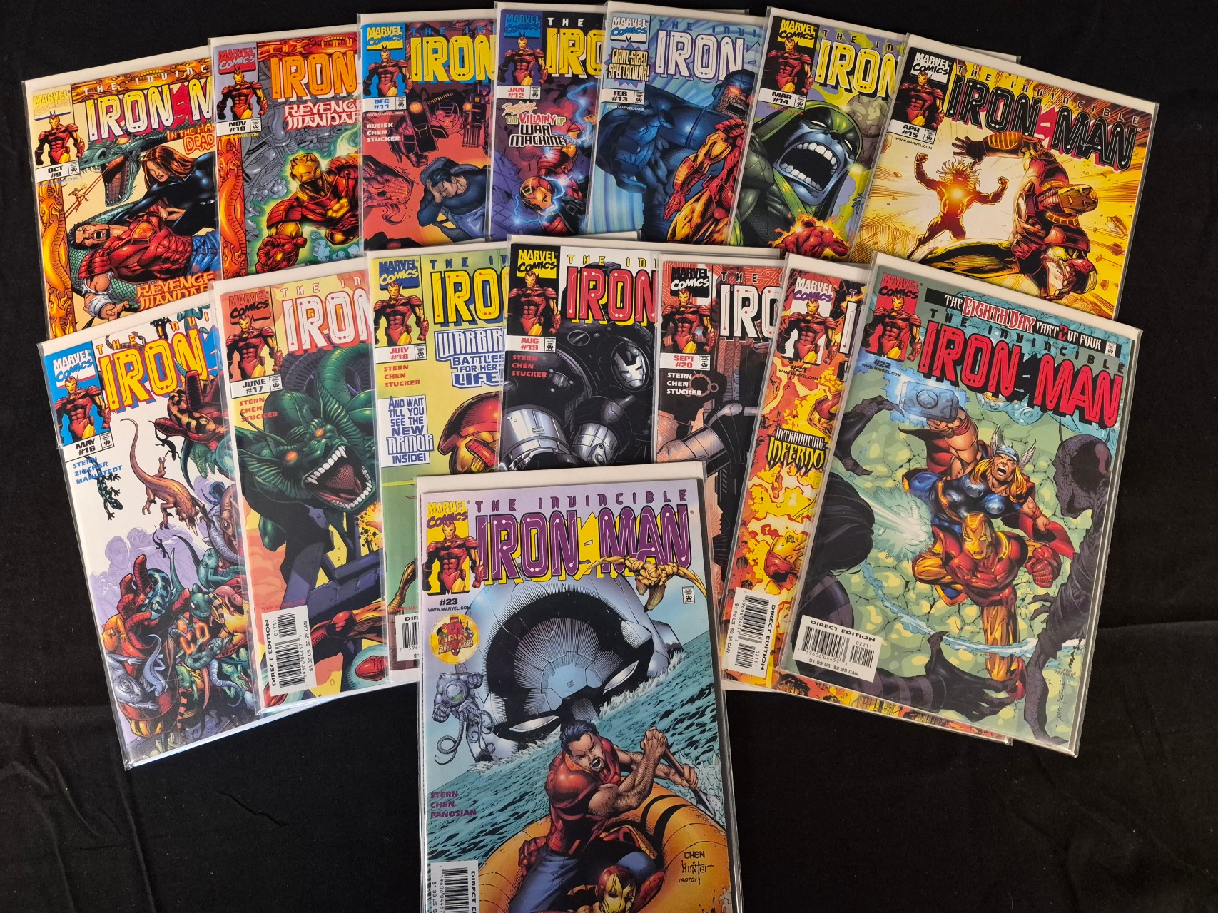 BID PER WHAT YOU SEE IN THE PHOTO, NOT THE AI GENERATED TITLES AND DESCRIPTIONS! This collection of Modern Age comic books features various issues of The Invincible Iron Man published by Marvel Comics, primarily dating from the late 1990s. The group includes a range of consecutive issues from number 9 through number 23. The series features work by creators such as Roger Stern, Kurt Busiek, Sean Chen, Bob Stucker, and Dan Panosian. Each comic is individually housed in a clear plastic protective sleeve. Visible text on the color-printed covers includes the series title, issue numbers, month of publication, Marvel branding, and Direct Edition barcodes with a 1.99 US dollar price point.