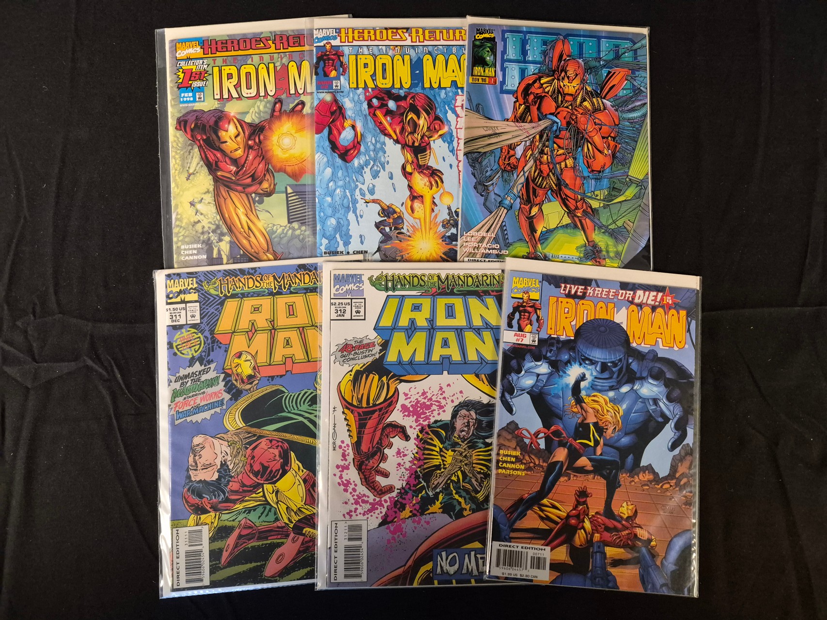 BID PER WHAT YOU SEE IN THE PHOTO, NOT THE AI GENERATED TITLES AND DESCRIPTIONS! A collection of Marvel Comics featuring several issues of The Invincible Iron Man published during the mid-to-late 1990s. The group includes various story arcs such as Hands of the Mandarin, Heroes Return, and Live Kree or Die!. Notable issues present are Iron Man #311 (December 1994), #312 (January 1995), #1 (November 1996), #1 (February 1998), #2 (March 1998), and #7 (August 1998). Issue #312 is identified as the conclusion to the Hands of the Mandarin storyline. These items are standard-format modern American superhero periodicals printed on paper. Each comic is individually housed in a clear protective plastic sleeve with a backing board.