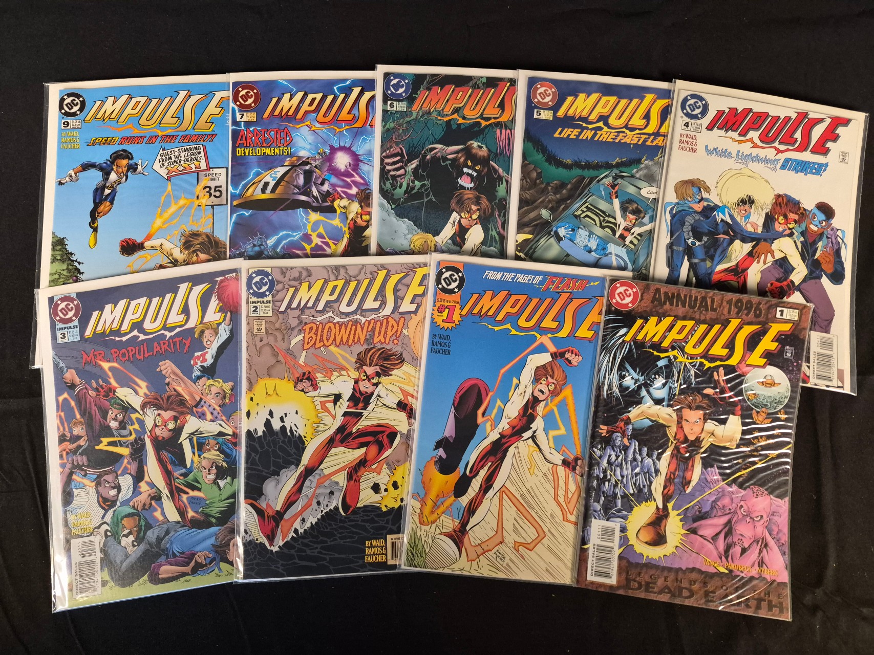 BID PER WHAT YOU SEE IN THE PHOTO, NOT THE AI GENERATED TITLES AND DESCRIPTIONS! A collection of Impulse comic books published by DC Comics, part of the series that debuted in 1995. The group includes various individual issues from the regular series alongside the Impulse Annual 1 from 1996 titled Legends of the Dead Earth. The series features characters from the Flash universe and includes creative contributions from Mark Waid, Humberto Ramos, and Wayne Faucher. The comics are printed on standard paper with glossy covers and display action-oriented cover art with titles including Blowin Up, Mr. Popularity, and Life in the Fast Lane. Each comic is individually stored in a clear plastic protective sleeve with a backing board.