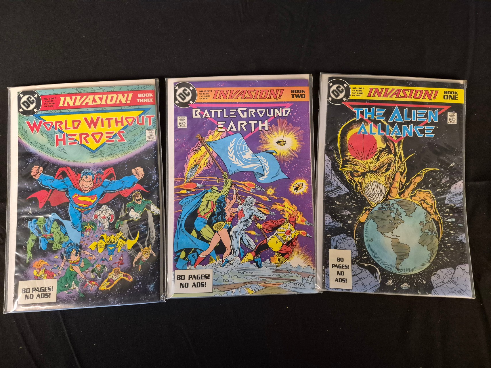 BID PER WHAT YOU SEE IN THE PHOTO, NOT THE AI GENERATED TITLES AND DESCRIPTIONS! A trio of comic books from the DC Comics limited series titled Invasion!, published between 1988 and 1989. The collection comprises the full three-issue run: Book One (The Alien Alliance), Book Two (Battleground Earth), and Book Three (World Without Heroes). Each issue is constructed with a glossy paper cover and contains 80 pages of content with no external advertisements. The series features artistic and narrative contributions from creators including Todd McFarlane and Bart Sears. Each item is housed in a clear protective plastic sleeve with a white backing board.