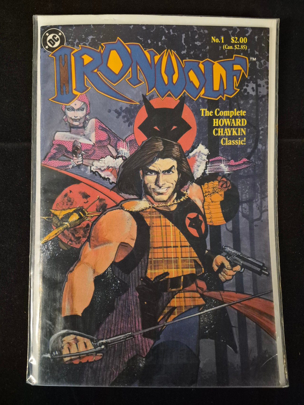 BID PER WHAT YOU SEE IN THE PHOTO, NOT THE AI GENERATED TITLES AND DESCRIPTIONS! This is a modern age comic book titled Ironwolf, issue number 1, published by DC Comics in 1986. The cover features artwork by Howard Chaykin, depicting a male protagonist with a sword and handgun, set against a background with a secondary female character and a stylized wolf-head emblem. Visible text includes the stylized Ironwolf title, the DC logo, and the original retail prices of $2.00 US and $2.85 Canadian. The cover also includes the text The Complete Howard Chaykin Classic. The item is presented in a clear protective plastic sleeve.