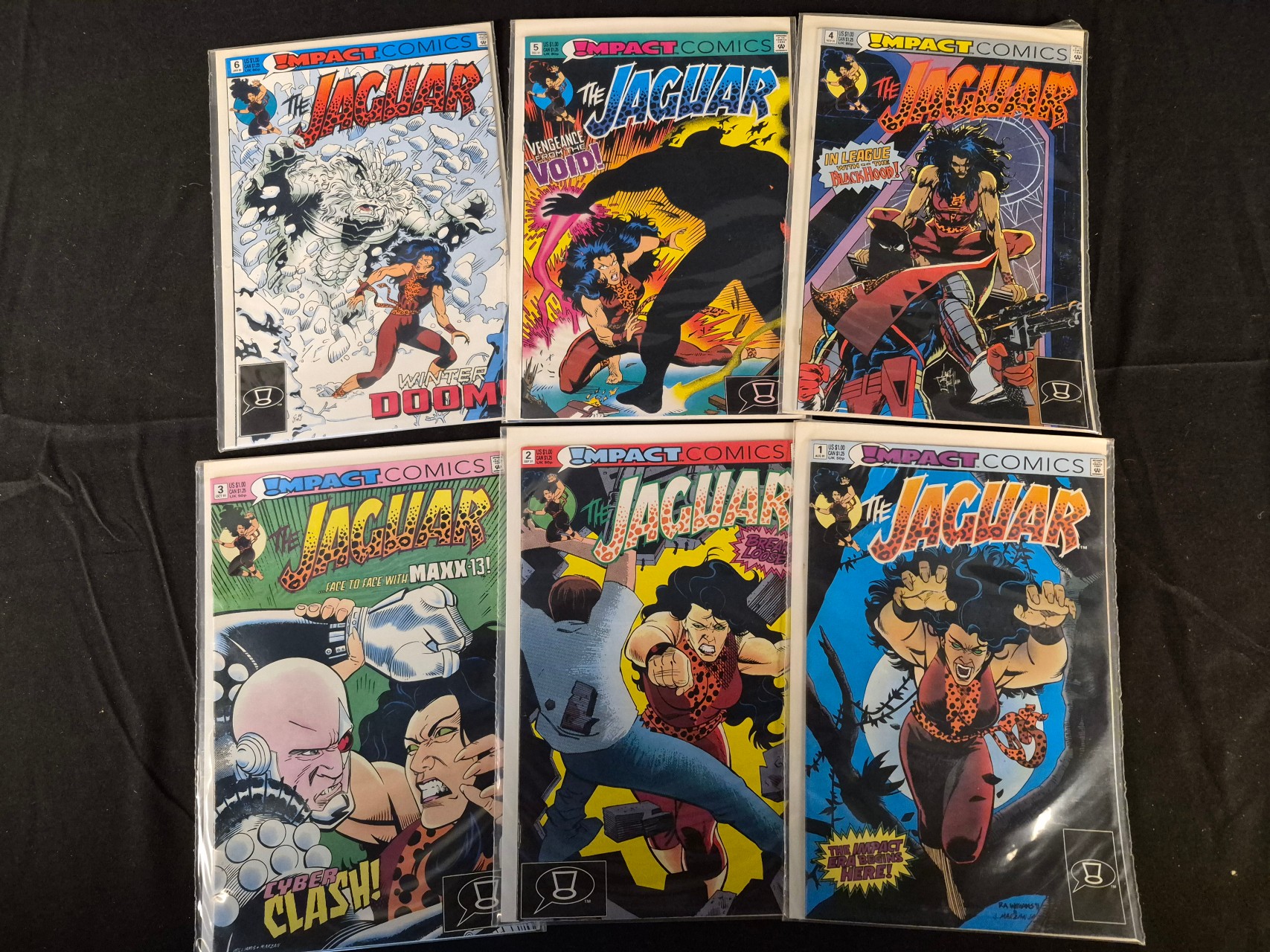 BID PER WHAT YOU SEE IN THE PHOTO, NOT THE AI GENERATED TITLES AND DESCRIPTIONS! A group of comic books from the series The Jaguar, published by Impact Comics, an imprint of DC Comics, starting in 1991. The collection features the superhero character The Jaguar across several individual issues. Visible issue numbers include 1, 2, 3, 4, 5, and 6. The covers exhibit the bold, colorful illustrative style of the early 1990s, including specific story titles such as Winter Doom, Vengeance from the Void!, and Cyber Clash!. Each comic is printed on standard paper and is individually housed within a clear plastic protective sleeve with a white backing board.