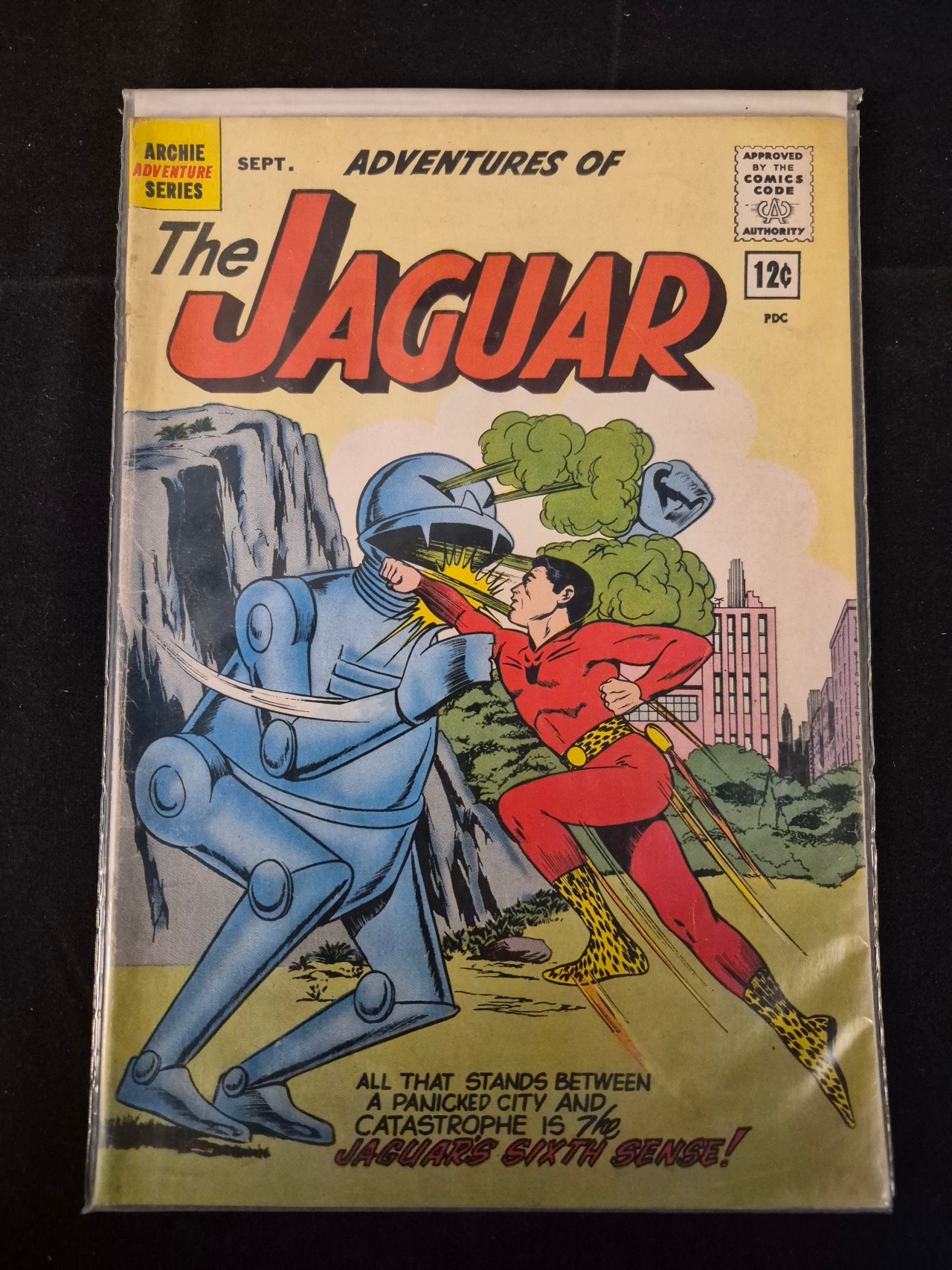 BID PER WHAT YOU SEE IN THE PHOTO, NOT THE AI GENERATED TITLES AND DESCRIPTIONS! Adventures of the Jaguar Issue 8, published by the Archie Adventure Series in September 1962. This Silver Age comic book features a color-printed paper cover with illustrative art depicting a superhero in a red costume with leopard-print accents in combat with a large blue robot. The scene is set against a backdrop of a city skyline and a rocky cliffside. Visible markings on the front cover include the series title, the month SEPT., a 12-cent price point, the PDC logo, and the Comics Code Authority seal. The lower margin features the tagline, ALL THAT STANDS BETWEEN A PANICKED CITY AND CATASTROPHE IS THE JAGUAR’S SIXTH SENSE! The interior consists of newsprint pages.
