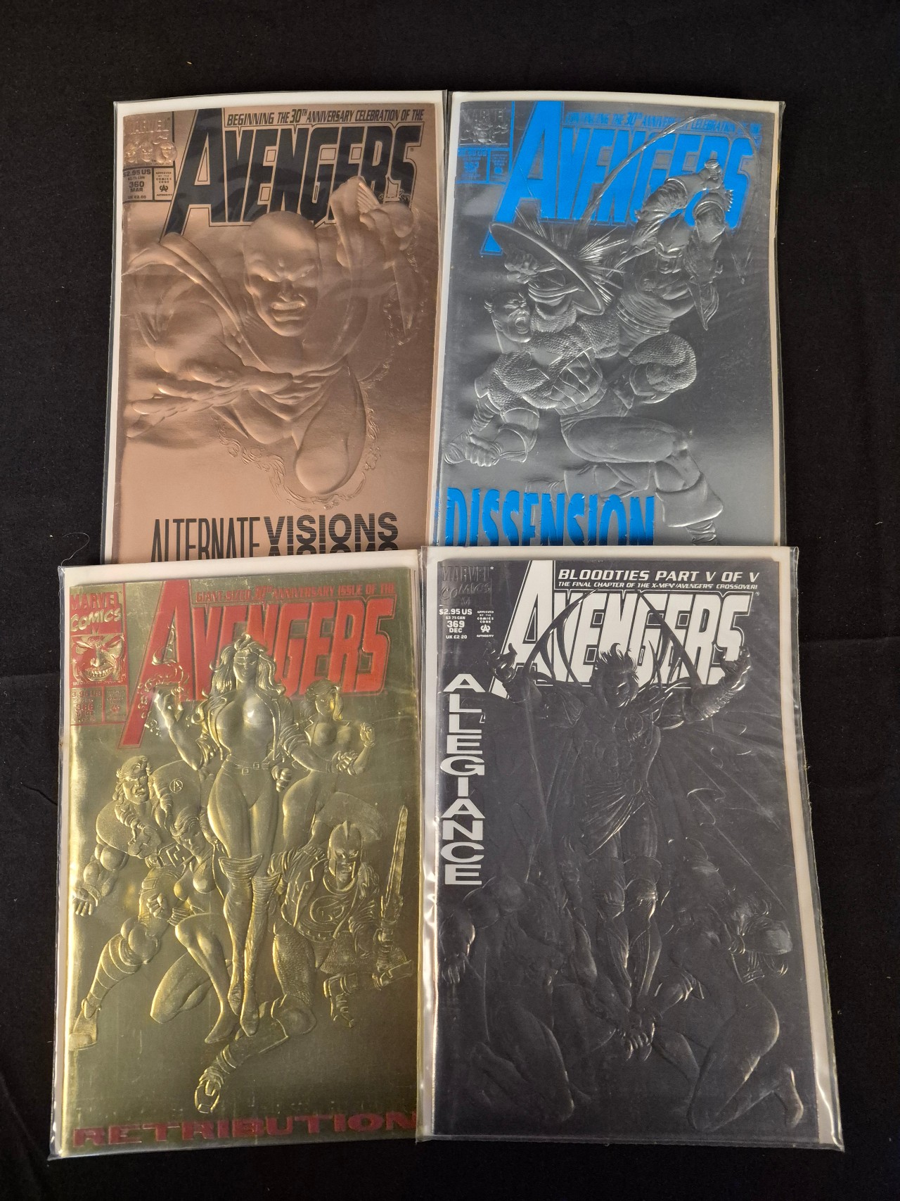 BID PER WHAT YOU SEE IN THE PHOTO, NOT THE AI GENERATED TITLES AND DESCRIPTIONS! A collection of Marvel Comics Avengers 30th anniversary special edition comic books published in 1993. The group includes issues #360 (Alternate Visions), #363 (Dissension), #366 (Retribution), and #369 (Allegiance). Each comic features a high-relief embossed foil cover in various metallic finishes including copper, blue, gold, and silver. These issues were released to commemorate the 30th anniversary of the Avengers franchise. Each comic is individually housed in a protective plastic sleeve.