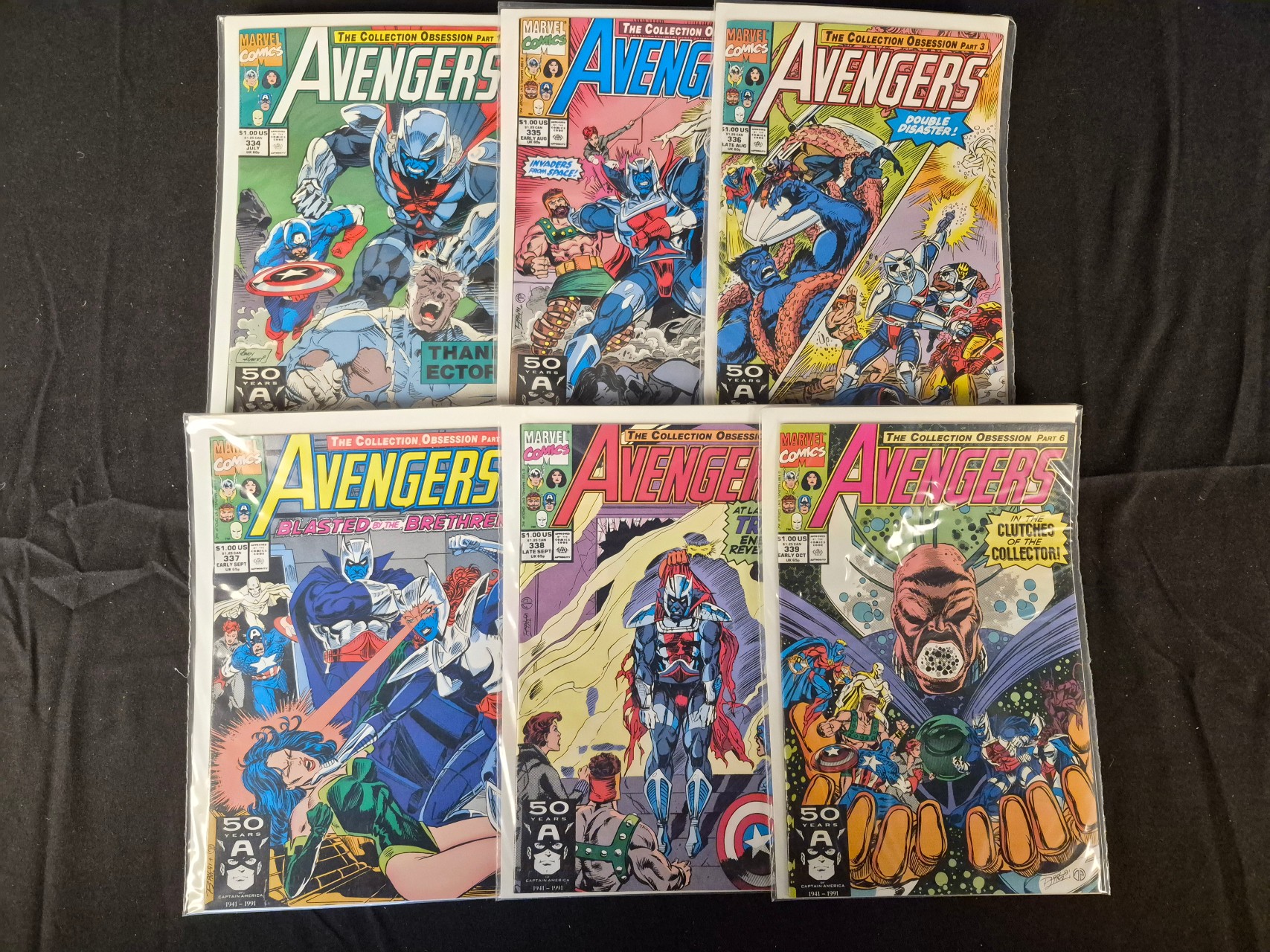BID PER WHAT YOU SEE IN THE PHOTO, NOT THE AI GENERATED TITLES AND DESCRIPTIONS! A collection of Marvel comic books from the Avengers series, published in 1991. The group comprises the six-part story arc titled The Collection Obsession, including issue numbers 334, 335, 336, 337, 338, and 339. The covers feature various Marvel characters and prominently display the 50 Years of Captain America 1941-1991 anniversary logo. Each comic is printed with color illustrations and is individually housed in a clear plastic protective sleeve.