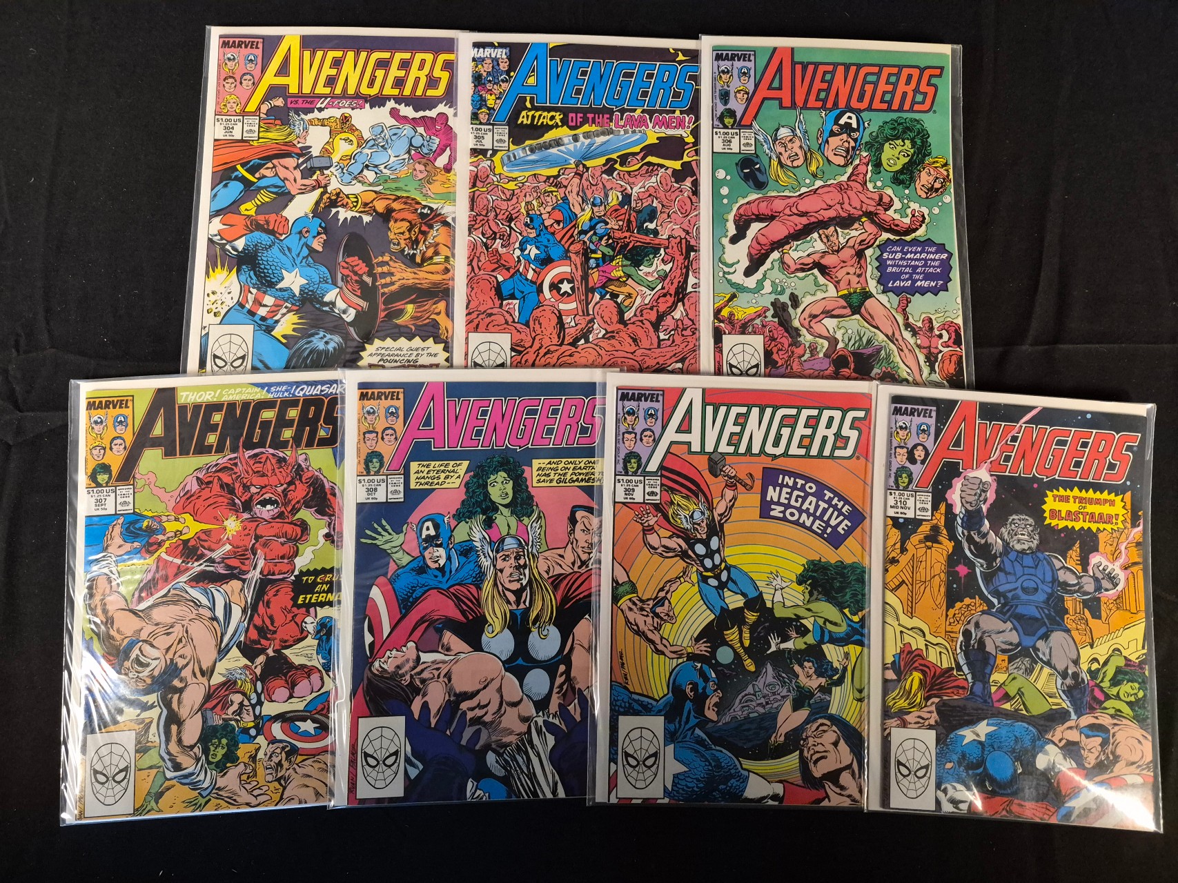 BID PER WHAT YOU SEE IN THE PHOTO, NOT THE AI GENERATED TITLES AND DESCRIPTIONS! A group of vintage American comic books from the series The Avengers, published by Marvel Comics. This collection includes issues 304 through 310, dating from 1989. The paper-based periodicals feature cover art characteristic of the late 1980s, with story titles such as Attack of the Lava Men!, Into the Negative Zone!, and The Triumph of Blastaar!. Each issue displays cover price markings of 1.00 US and 1.25 CAN and is housed in a clear protective plastic sleeve.