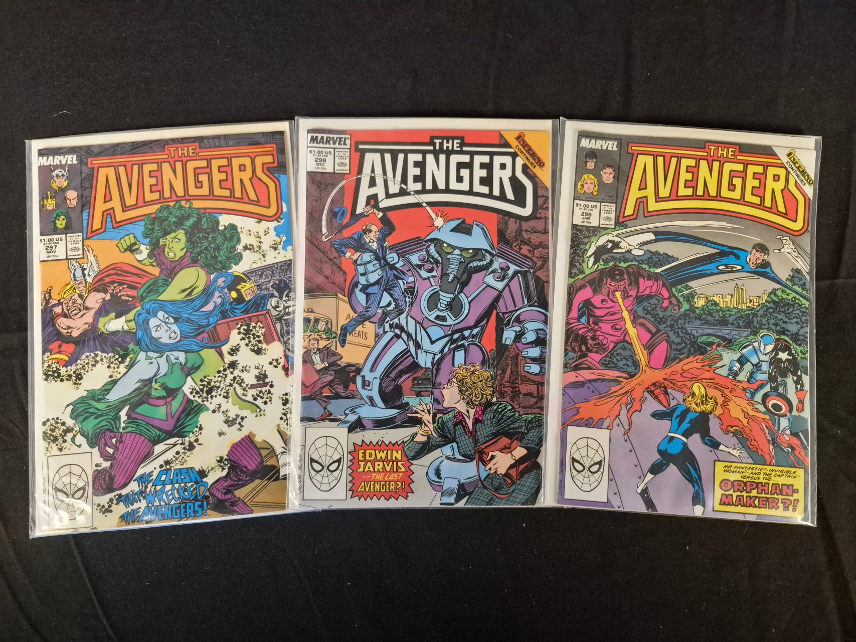 BID PER WHAT YOU SEE IN THE PHOTO, NOT THE AI GENERATED TITLES AND DESCRIPTIONS! A trio of Marvel Comics comic books from The Avengers series, featuring issues 297, 298, and 299, published circa 1988-1989. These Modern Age collectibles are printed on paper with full-color graphic cover illustrations. Issue 297 features the story teaser The Clash That Wrecked The Avengers!, while issues 298 and 299 include the Inferno Continues crossover event banners. Each comic is presented in a protective clear plastic sleeve with a cardboard backing board. The covers display standard Marvel branding, issue numbers, and original price markings.