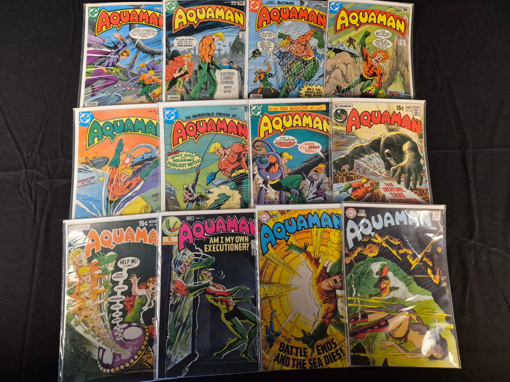 BID PER WHAT YOU SEE IN THE PHOTO, NOT THE AI GENERATED TITLES AND DESCRIPTIONS! This collection of DC Comics Aquaman titles includes issues from the Silver and Bronze Ages, dating from the late 1960s through the late 1970s. The group contains issues 48, 50, 51, 53, 54, 55, 56, 57, 58, 59, 62, and 63. Issue 51 features a guest appearance by Batman. Cover prices range from 15 cents to 35 cents. Each comic is individually housed in a clear plastic protective sleeve. The items feature printed color cover art on newsprint paper.