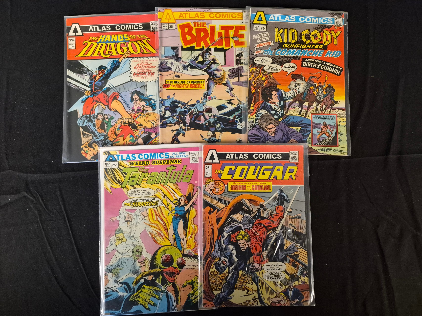 BID PER WHAT YOU SEE IN THE PHOTO, NOT THE AI GENERATED TITLES AND DESCRIPTIONS! A collection of Atlas Comics Bronze Age comic books published in 1975. This grouping includes several first issues such as The Hands of the Dragon No. 1 (June), The Brute No. 1 (February), Kid Cody Gunfighter starring the Comanche Kid No. 1 (February), and Weird Suspense featuring The Tarantula No. 1 (February), along with The Cougar No. 2 (July). Each publication is printed on standard newsprint and features the stylized Atlas A logo, the Comics Code Authority seal, and a 25 cent price mark on the front cover. The comics are individually housed in clear protective plastic sleeves.