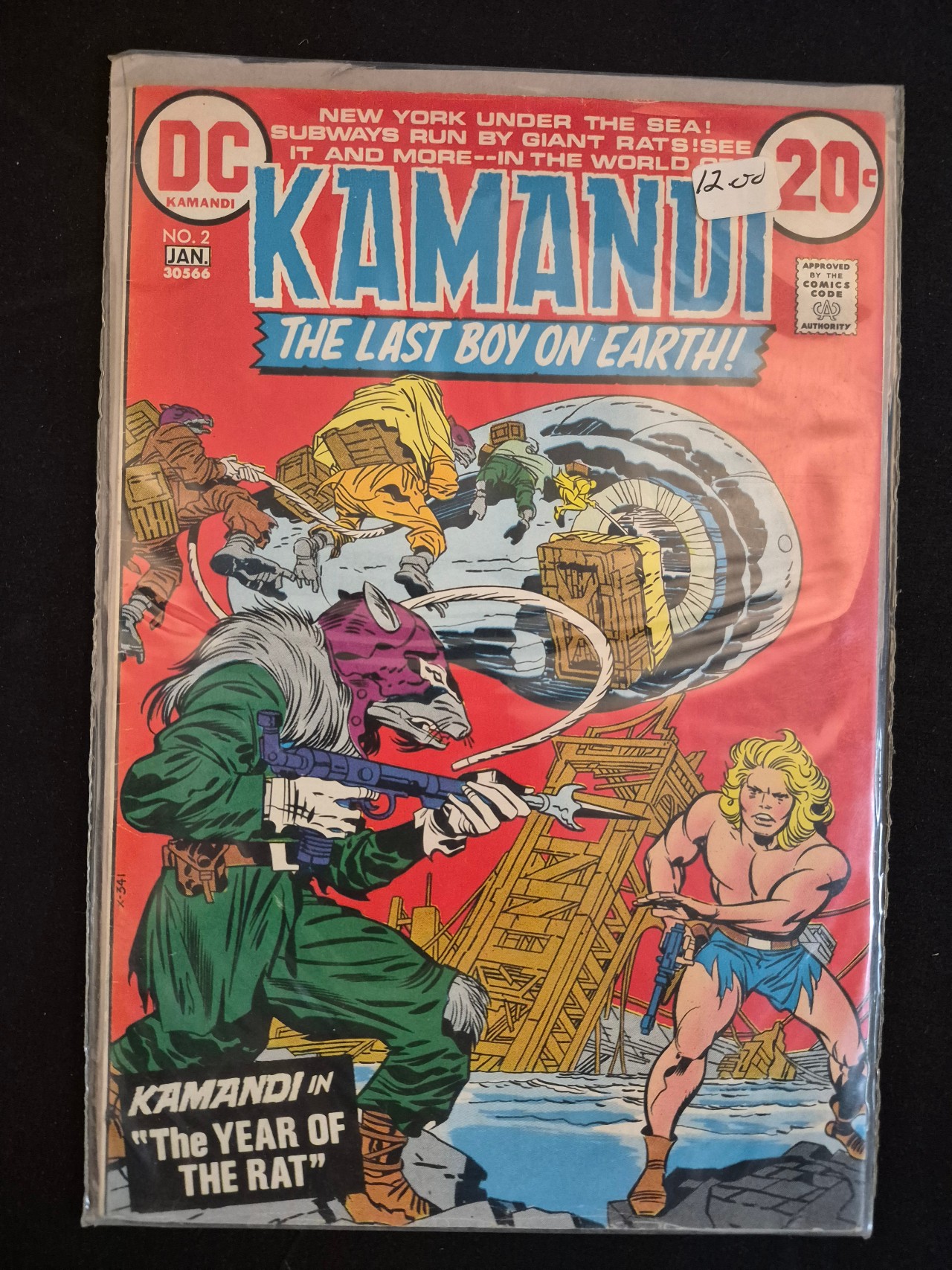 BID PER WHAT YOU SEE IN THE PHOTO, NOT THE AI GENERATED TITLES AND DESCRIPTIONS! This is a single issue of the DC Comics series Kamandi: The Last Boy on Earth, specifically issue number 2, dated January 1973. The cover features illustration by Jack Kirby depicting the protagonist Kamandi and anthropomorphic rat figures, corresponding to the story title The Year of the Rat printed in the lower-left corner. The publication displays a 20-cent cover price and the Approved by the Comics Code Authority seal. The comic is presented in its original paper format within a clear plastic protective sleeve.