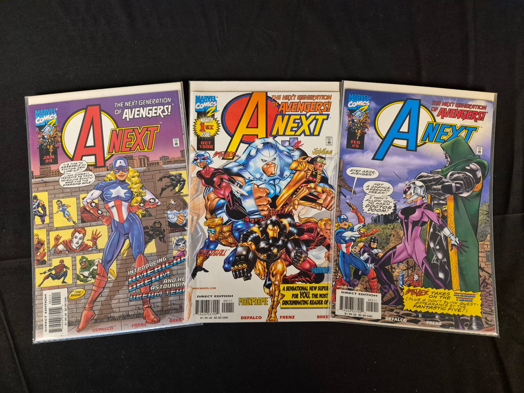 BID PER WHAT YOU SEE IN THE PHOTO, NOT THE AI GENERATED TITLES AND DESCRIPTIONS! A trio of A-Next The Next Generation of Avengers comic books published by Marvel Comics under the MC2 imprint during the late 1990s. This collection includes issue number 1 (October 1998), issue number 4 (January 1999), and issue number 5 (February 1999). These Modern Age publications feature staple-bound construction with cover art and stories by Tom DeFalco and Ron Frenz. Issue number 1 is identified by a Mighty 1st Issue banner, while issue number 4 features the introduction of the character American Dream. Issue number 5 includes appearances by Stinger and Doctor Doom. Each publication displays a direct edition barcode and an original cover price of 1.99 USD. The comics are individually housed in clear protective plastic sleeves with rigid backing boards.