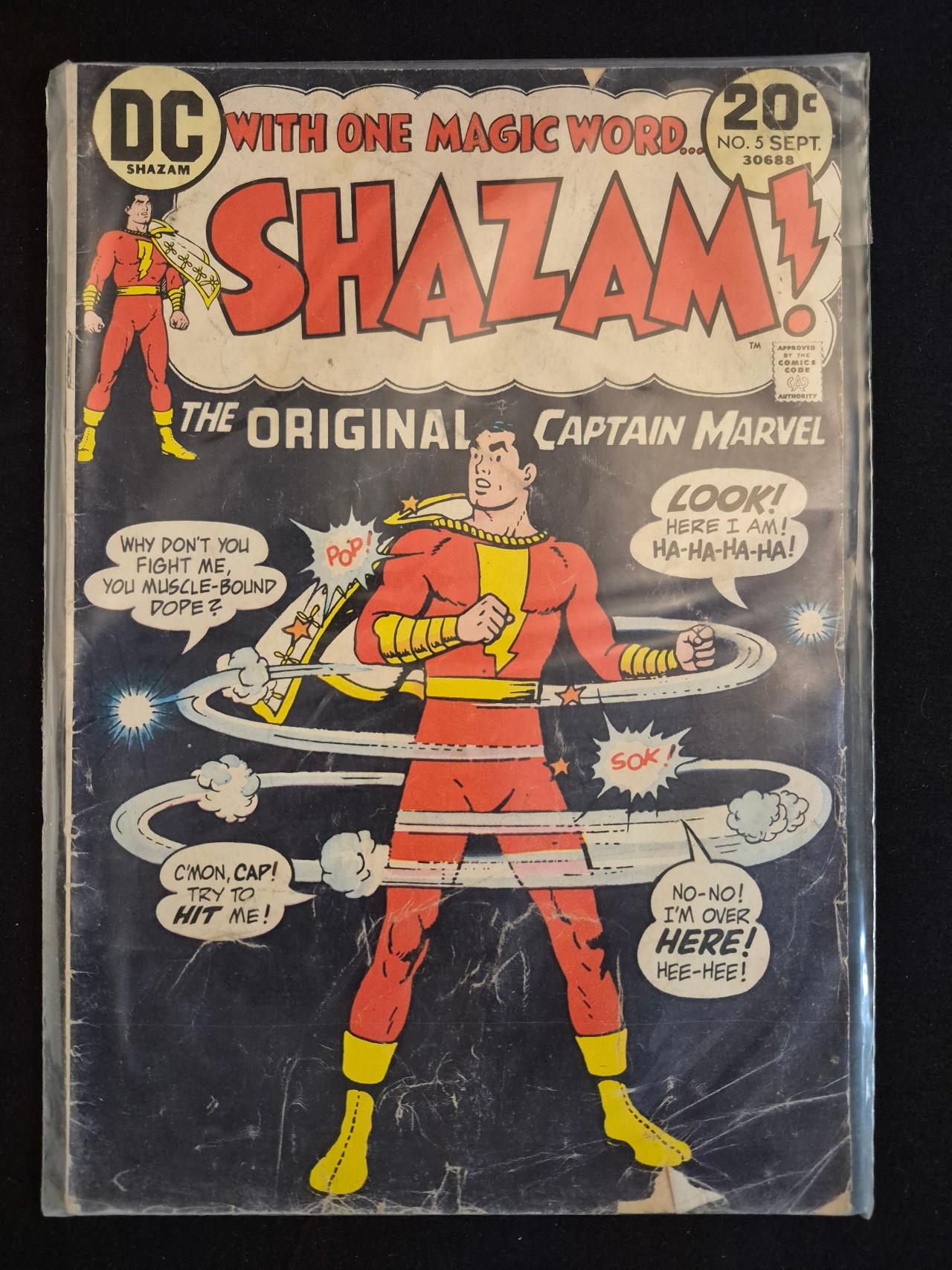 BID PER WHAT YOU SEE IN THE PHOTO, NOT THE AI GENERATED TITLES AND DESCRIPTIONS! This is an issue of the DC comic book series Shazam! The Original Captain Marvel, specifically issue number 5, dated September 1973. The cover features a 20-cent price point, consistent with Bronze Age publications. The printed paper cover displays a central illustration of Captain Marvel in a red and gold uniform with a yellow lightning bolt insignia, surrounded by motion lines and several speech bubbles. The top left corner bears the circular DC logo with the word Shazam beneath it. The title Shazam! is printed in large red block letters with a yellow lightning bolt as the exclamation point. The seal of the Comics Code Authority is visible on the right side. The comic is presented in a clear plastic protective sleeve.