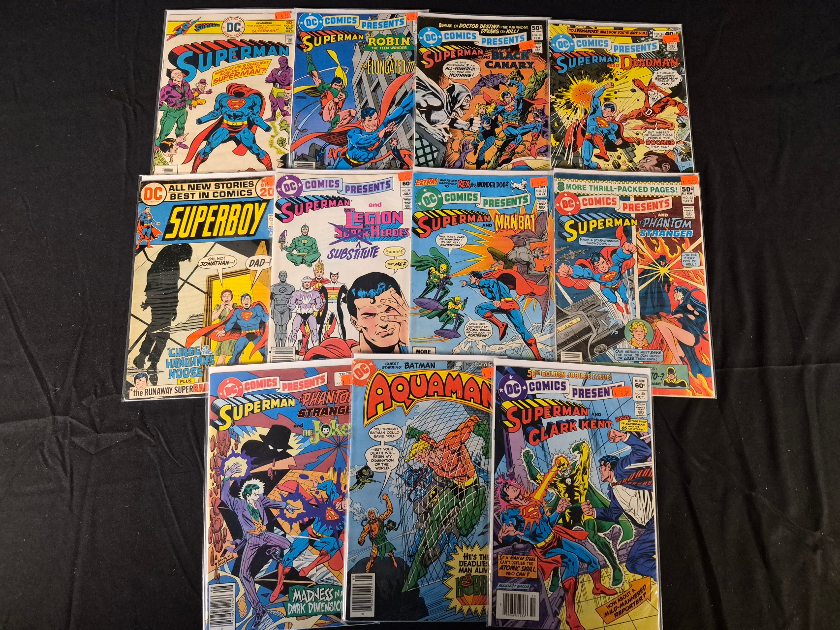 BID PER WHAT YOU SEE IN THE PHOTO, NOT THE AI GENERATED TITLES AND DESCRIPTIONS! A collection of vintage DC Comics from the late Bronze Age, primarily featuring the DC Comics Presents series and Superman-related titles. The group includes Aquaman issue No. 61 from 1978, which features a guest appearance by Batman and Kobra. Other titles in the collection include DC Comics Presents issues No. 24 featuring Deadman, No. 25 featuring Phantom Stranger, No. 30 featuring Black Canary, No. 31 featuring Robin, No. 35 featuring Man-Bat, No. 50 featuring Clark Kent, and No. 59 featuring the Legion of Super-Heroes. Also included are Superboy No. 201 and a DC Comics Presents issue featuring the Joker. The comics are printed in full color on standard paper and are housed in individual protective plastic sleeves with backing boards. Original cover prices range from 40 to 60 cents. Visible markings include DC logos and various issue numbers.
