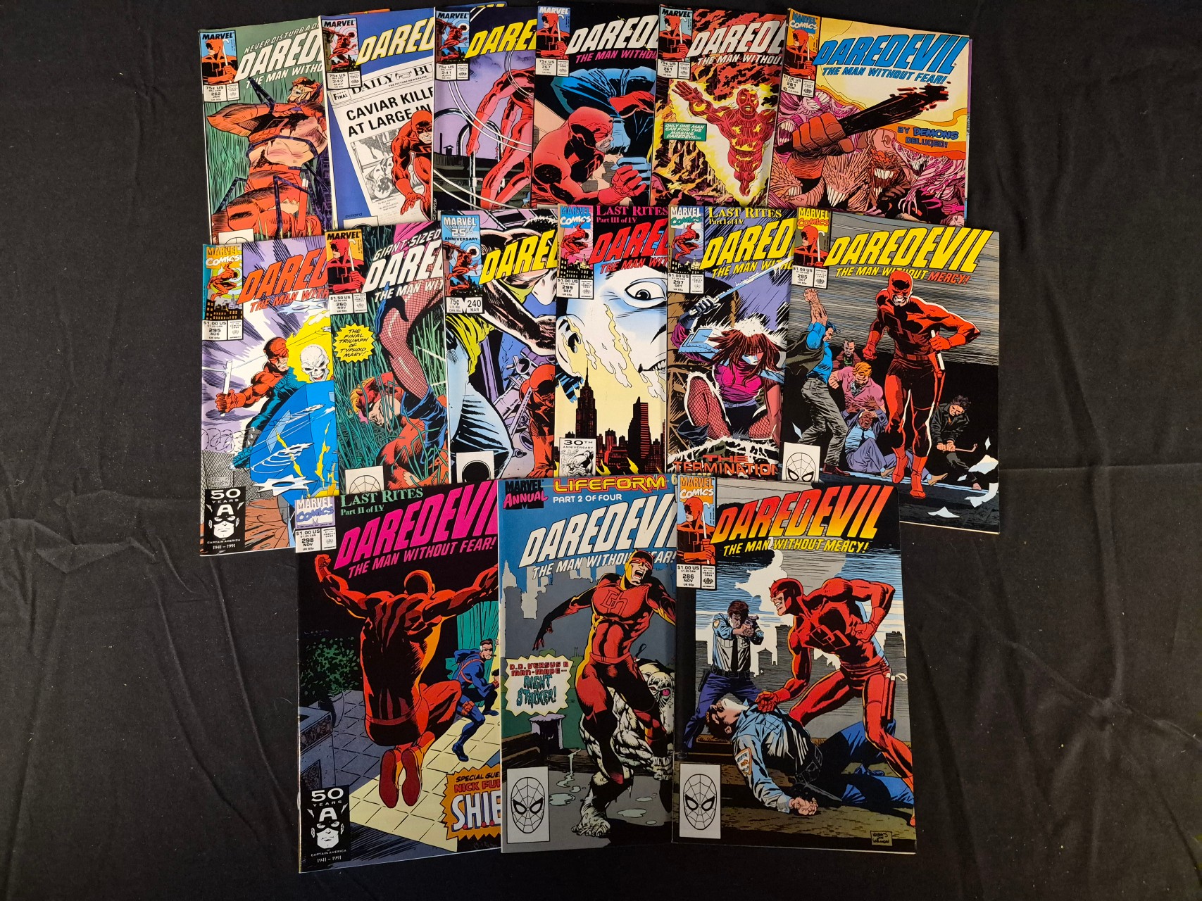 BID PER WHAT YOU SEE IN THE PHOTO, NOT THE AI GENERATED TITLES AND DESCRIPTIONS! A collection of Marvel Comics Daredevil: The Man Without Fear! staple-bound comic books, primarily dating from the late 1980s to early 1990s. This Copper Age group includes issues 240, 241, 242, 260, 261, 262, 267, 280, 286, 290, 293, 297, 298, and 299, along with a Daredevil Annual. The covers feature the Marvel Comics corner box logo and original retail prices ranging from $0.75 to $2.00. Notable story arcs identified on the covers include Last Rites, Lifeform, and The Termination. Several issues also feature the Captain America 50th-anniversary commemorative logo.