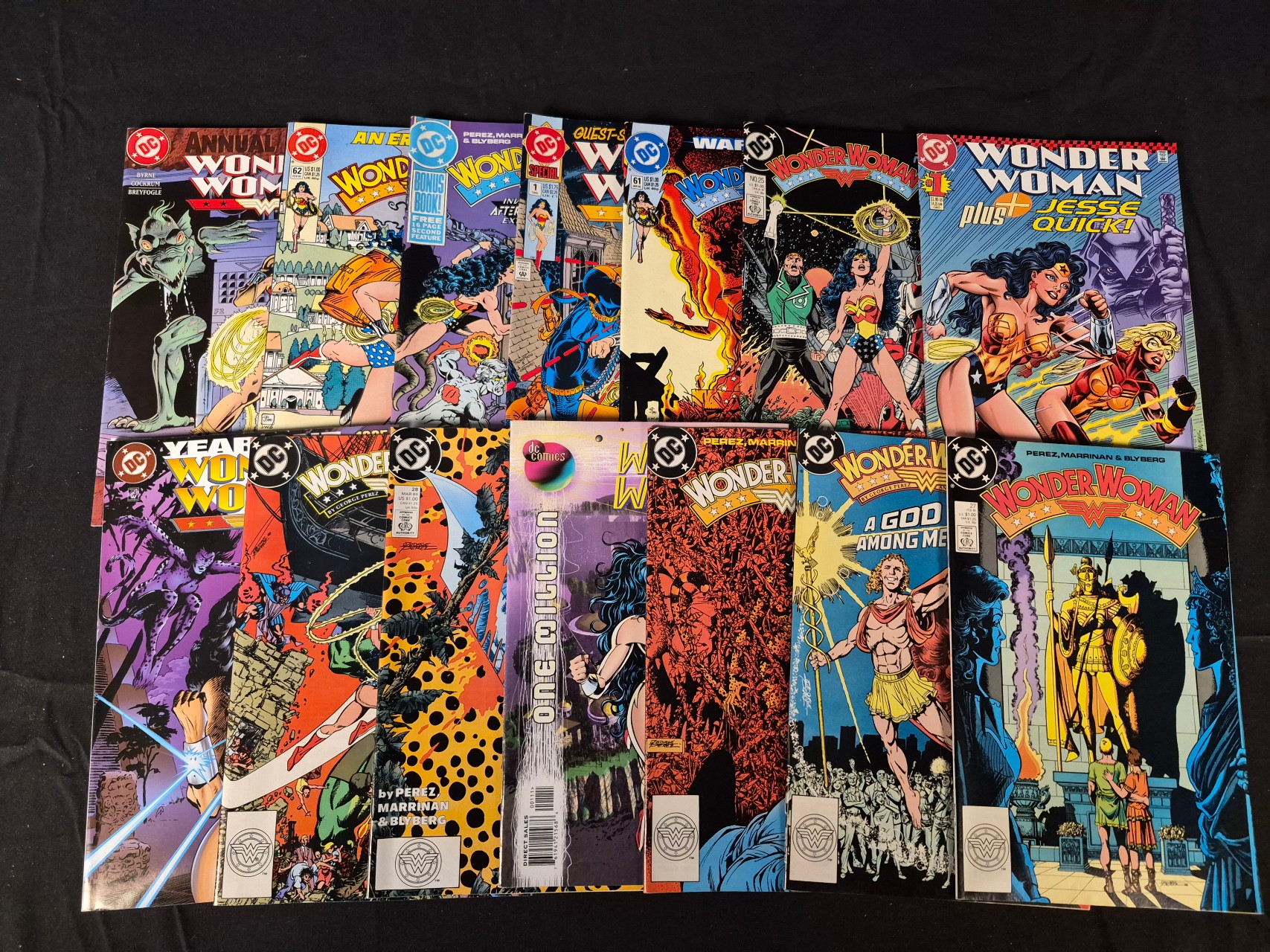 BID PER WHAT YOU SEE IN THE PHOTO, NOT THE AI GENERATED TITLES AND DESCRIPTIONS! A collection of DC Comics featuring Wonder Woman, dating from the late 1980s to the late 1990s. The group consists of various editions including standard monthly issues, annuals, and special editions such as Wonder Woman Plus Jesse Quick and DC One Million. The covers feature full-color illustrations with creator credits for notable artists and writers including George Perez, John Byrne, Marinan, and Blyberg. The items are constructed from standard printed comic book paper. The lot includes issues from the George Perez run, the John Byrne era, and crossover events.