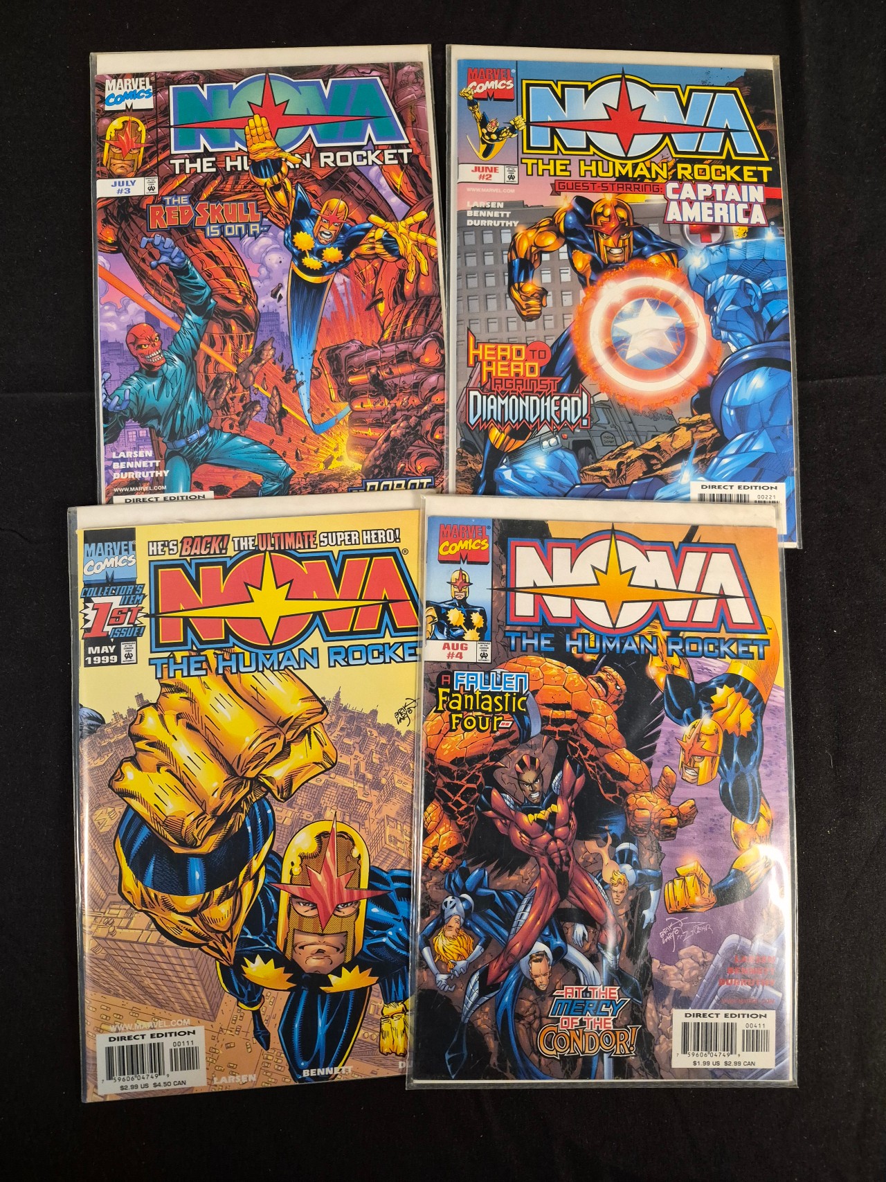 BID PER WHAT YOU SEE IN THE PHOTO, NOT THE AI GENERATED TITLES AND DESCRIPTIONS! This collection features several issues from the Marvel Comics series Nova The Human Rocket, published in 1999. The group includes issues one, two, three, and four. The cover illustrations depict the character Nova alongside other Marvel Universe figures such as the Red Skull, Captain America, and the Fantastic Four. Cover credits list artists Erik Larsen, Joe Bennett, and Armando Durruthy. These Modern Age comic books are printed with full-color graphics and are identified as direct editions.