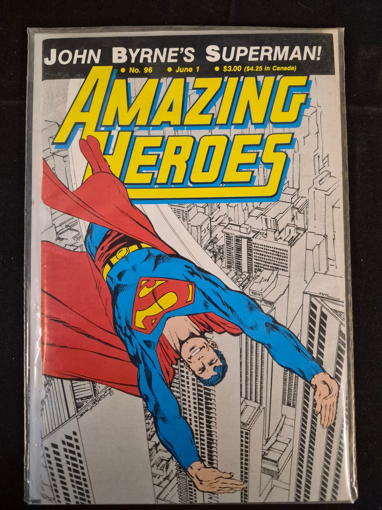 BID PER WHAT YOU SEE IN THE PHOTO, NOT THE AI GENERATED TITLES AND DESCRIPTIONS! This is a copy of Amazing Heroes magazine, issue number 96, published by Fantagraphics Books and dated June 1, 1986. The cover features a full-color illustration of Superman in flight by artist John Byrne, set against a black-and-white line-drawn cityscape background. The magazine is presented in a standard comic book format. Text at the top margin includes the title Amazing Heroes in yellow and blue, with a black banner reading John Byrne’s Superman! The original cover price is listed as $3.00 ($4.25 in Canada). The item is housed in a clear plastic protective sleeve.