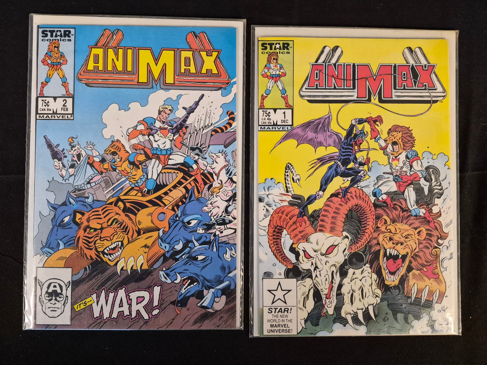 BID PER WHAT YOU SEE IN THE PHOTO, NOT THE AI GENERATED TITLES AND DESCRIPTIONS! A pair of vintage Animax comic books published by Star Comics, an imprint of Marvel Comics, dating from 1986 and 1987. The lot includes issue number 1 (December 1986) and issue number 2 (February 1987). These softcover paper publications feature multi-colored cover art depicting anthropomorphic warriors and mechanical creatures in a science-fiction setting. Each issue displays the Animax title logo, Star Comics and Marvel branding, and a cover price of 75 cents. The comics are presented in individual clear plastic protective sleeves with white backing boards.