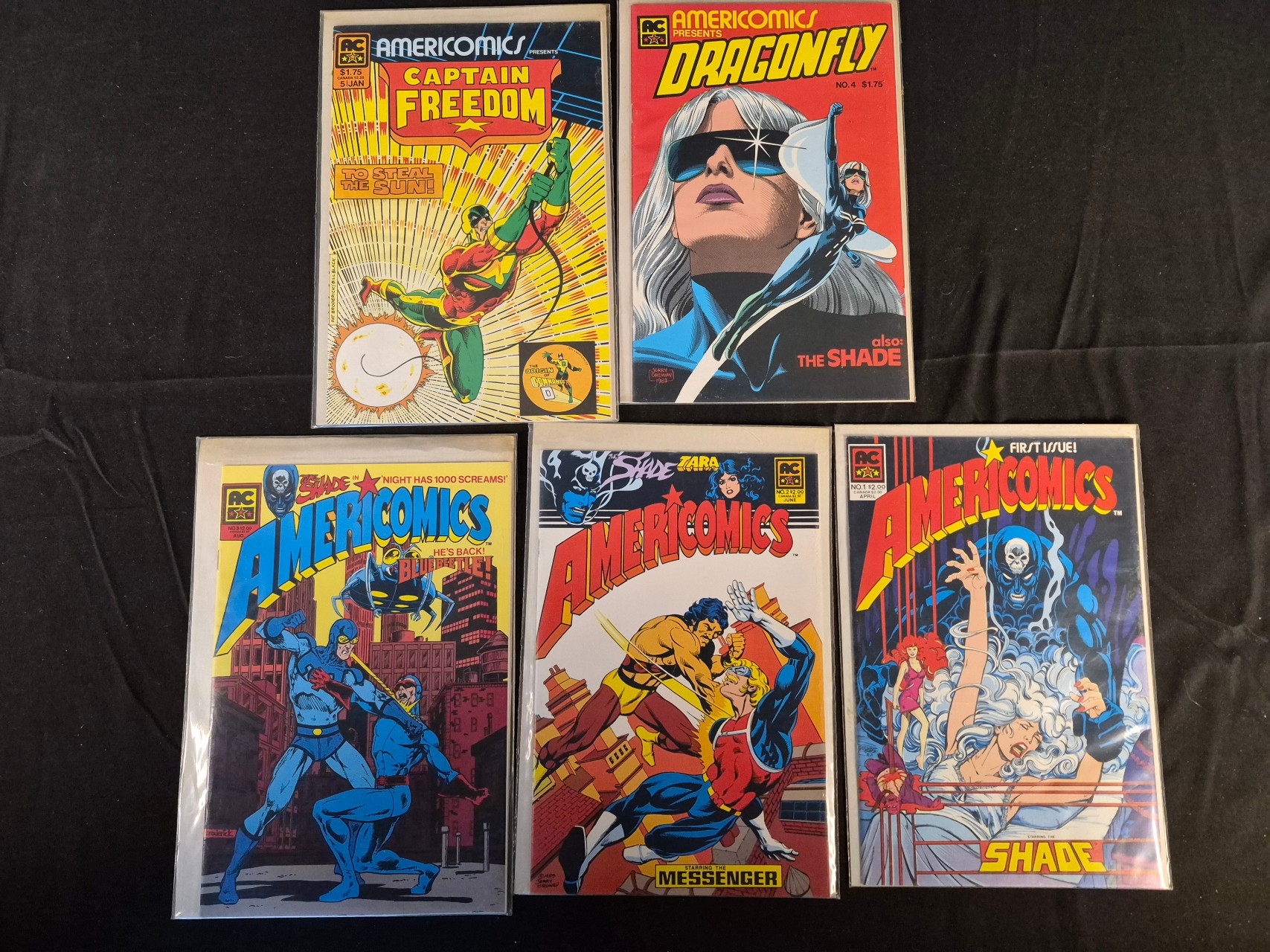 BID PER WHAT YOU SEE IN THE PHOTO, NOT THE AI GENERATED TITLES AND DESCRIPTIONS! A group of vintage American comic books published by AC Comics under the Americomics banner, dating to the early 1980s. The collection includes various superhero titles such as Captain Freedom No. 5 (January 1984), Dragonfly No. 4, and issues from the Americomics anthology series including No. 1 (April) featuring The Shade, No. 2 (June 1983) featuring The Messenger and Tara Fremont, and No. 3 (August) featuring Blue Beetle. The covers feature vibrant color illustrations with original retail prices of $1.75 and $2.00. Each comic is housed in an individual protective plastic sleeve.
