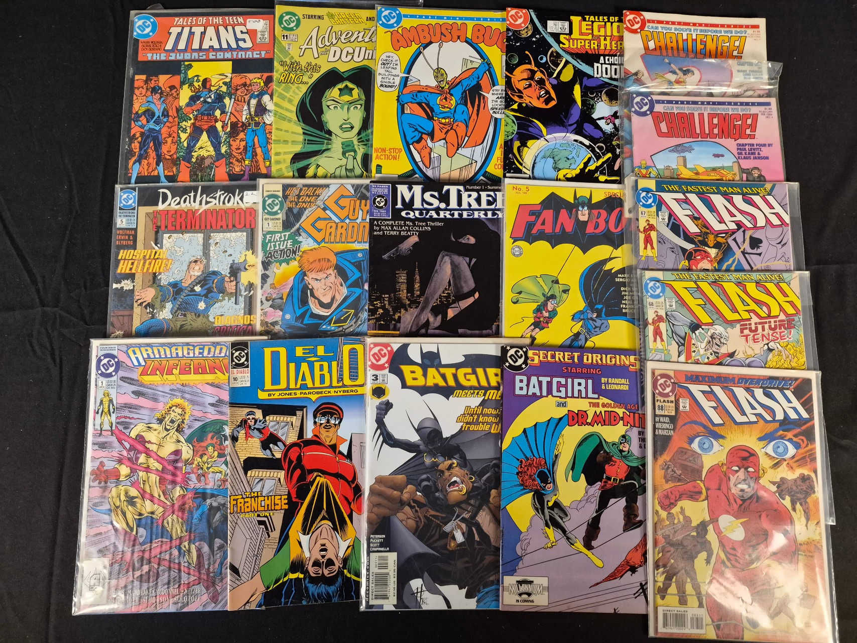 BID PER WHAT YOU SEE IN THE PHOTO, NOT THE AI GENERATED TITLES AND DESCRIPTIONS! A collection of DC comic books primarily dating from the mid-1980s to the mid-1990s. The group features a variety of superhero and action titles including Tales of the Teen Titans, Ambush Bug, Deathstroke the Terminator, Guy Gardner, Ms. Tree Quarterly, Fan Boy, The Flash, Armageddon Inferno, El Diablo, Batgirl, Challenge!, and Secret Origins. Several issues are identified as first issues or premiere installments within their respective series. The comics are printed on standard paper stock with color-illustrated covers. Each individual comic is housed in a protective plastic sleeve. Visible titles include Guy Gardner issue number 1, Ms. Tree Quarterly issue number 1, and Armageddon Inferno issue number 1.