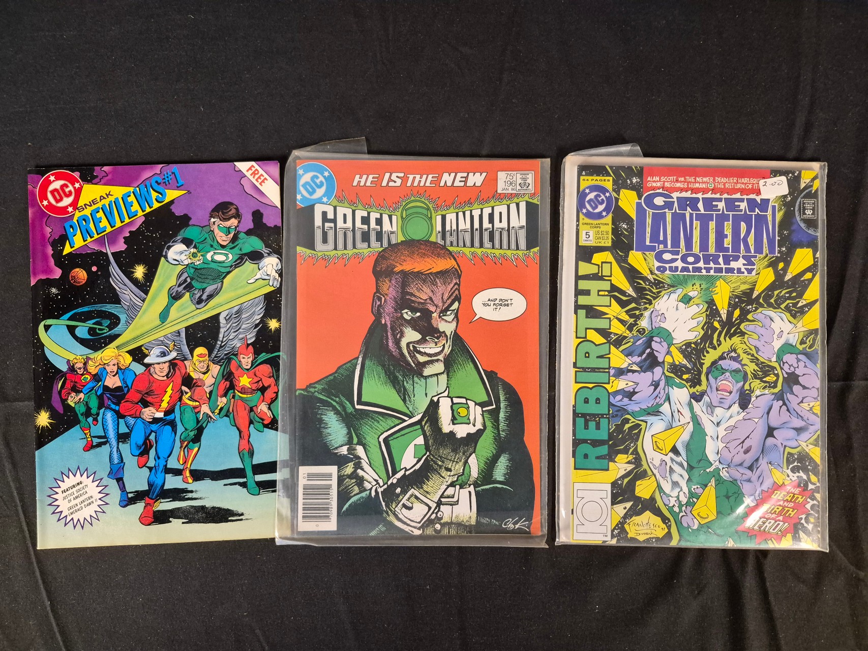 BID PER WHAT YOU SEE IN THE PHOTO, NOT THE AI GENERATED TITLES AND DESCRIPTIONS! A trio of DC Comics publications centered on the Green Lantern franchise. The collection includes Sneak Previews issue 1 featuring the Justice Society of America and Green Lantern: Emerald Dawn II, Green Lantern issue 196 dated January 1986, and Green Lantern Corps Quarterly issue 5 dated Summer 1993. These Modern Age comic books feature full-color cover art printed on paper. Green Lantern 196 features Guy Gardner on the cover with art by Joe Staton and Bruce Patterson. Green Lantern Corps Quarterly 5 is a 64-page anthology issue. Visible cover prices include 75 cents and 2.50 US dollars, while the promotional preview issue is marked free.
