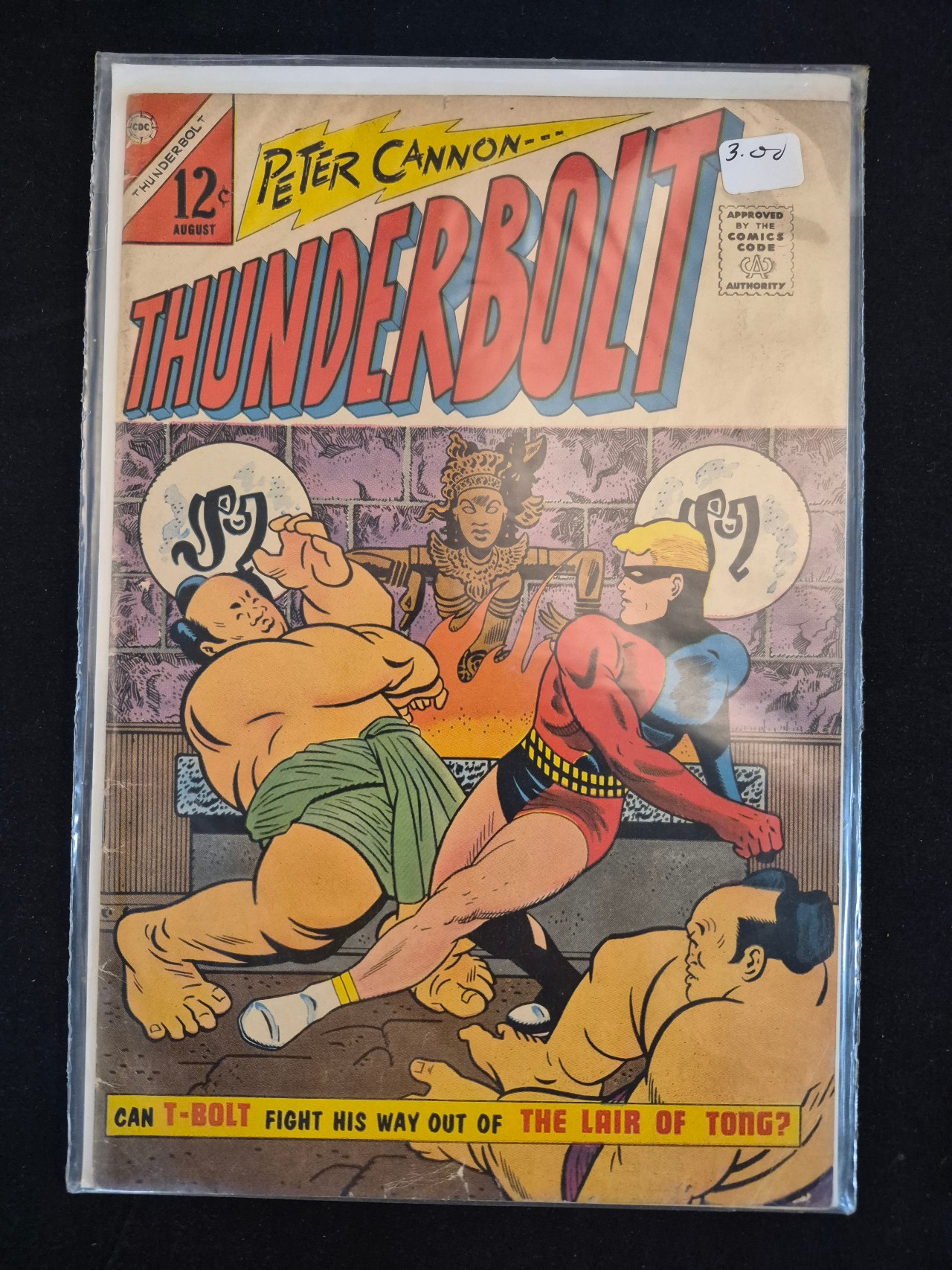 BID PER WHAT YOU SEE IN THE PHOTO, NOT THE AI GENERATED TITLES AND DESCRIPTIONS! Peter Cannon… Thunderbolt #53 is a Silver Age comic book published by Charlton Comics with an August 1966 cover date. The cover displays a 12-cent original price and the CDC publisher logo. The cover art depicts the protagonist in a combat scene against two sumo wrestlers in a stylized setting, accompanied by the teaser text, CAN T-BOLT FIGHT HIS WAY OUT OF THE LAIR OF TONG?. The Comics Code Authority seal is present in the upper right corner. The item is presented in a protective plastic sleeve.