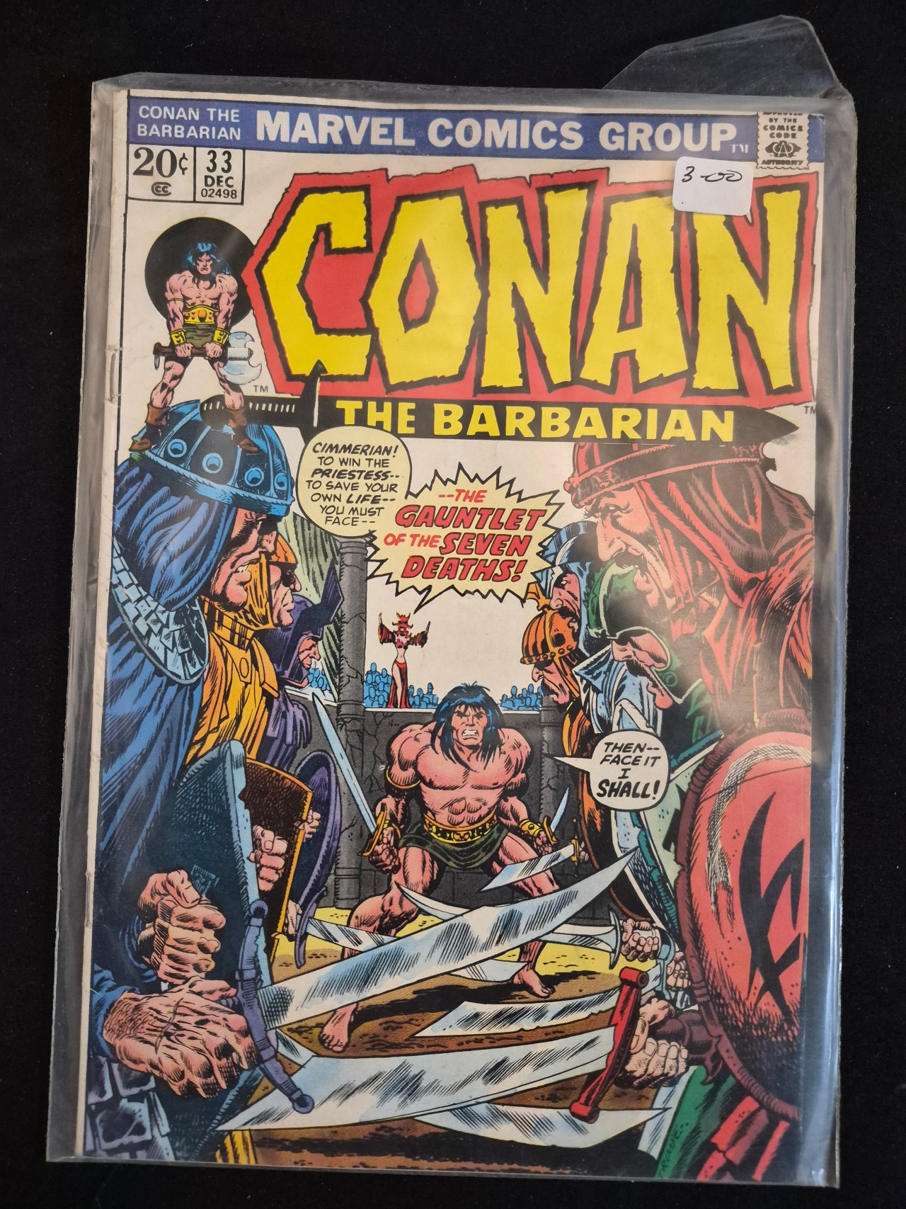 BID PER WHAT YOU SEE IN THE PHOTO, NOT THE AI GENERATED TITLES AND DESCRIPTIONS! A Bronze Age comic book, Conan the Barbarian issue number 33, published by the Marvel Comics Group in December 1973. The cover features dynamic illustrations for the story titled The Gauntlet of the Seven Deaths! and includes the 20-cent price point and the Comics Code Authority seal. This issue is identified as a key issue in the series, marking the third appearance of the character Red Sonja. The item is a standard staple-bound comic book printed on paper.