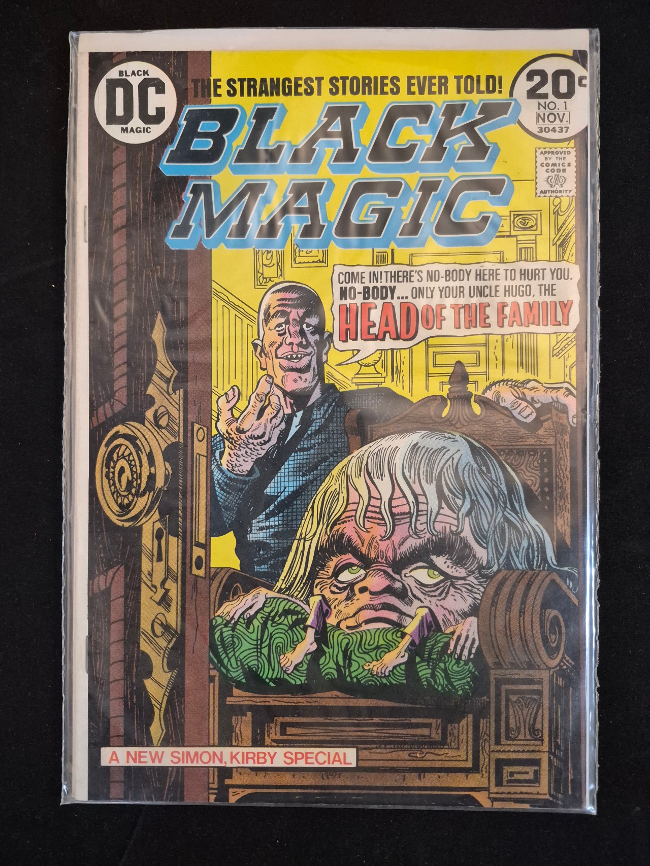 BID PER WHAT YOU SEE IN THE PHOTO, NOT THE AI GENERATED TITLES AND DESCRIPTIONS! This is a copy of Black Magic No. 1, a Bronze Age horror comic book published by DC Comics in November 1973. The issue is identified as A New Simon, Kirby Special, featuring the collaborative work of Joe Simon and Jack Kirby. The cover art depicts a character referred to as Uncle Hugo and a large disembodied head situated in an ornate wooden chair, accompanied by the text Head of the Family. The front cover displays a 20-cent price point, the DC Black Magic circular logo, and the seal of the Comics Code Authority. The publication is a standard staple-bound comic book.