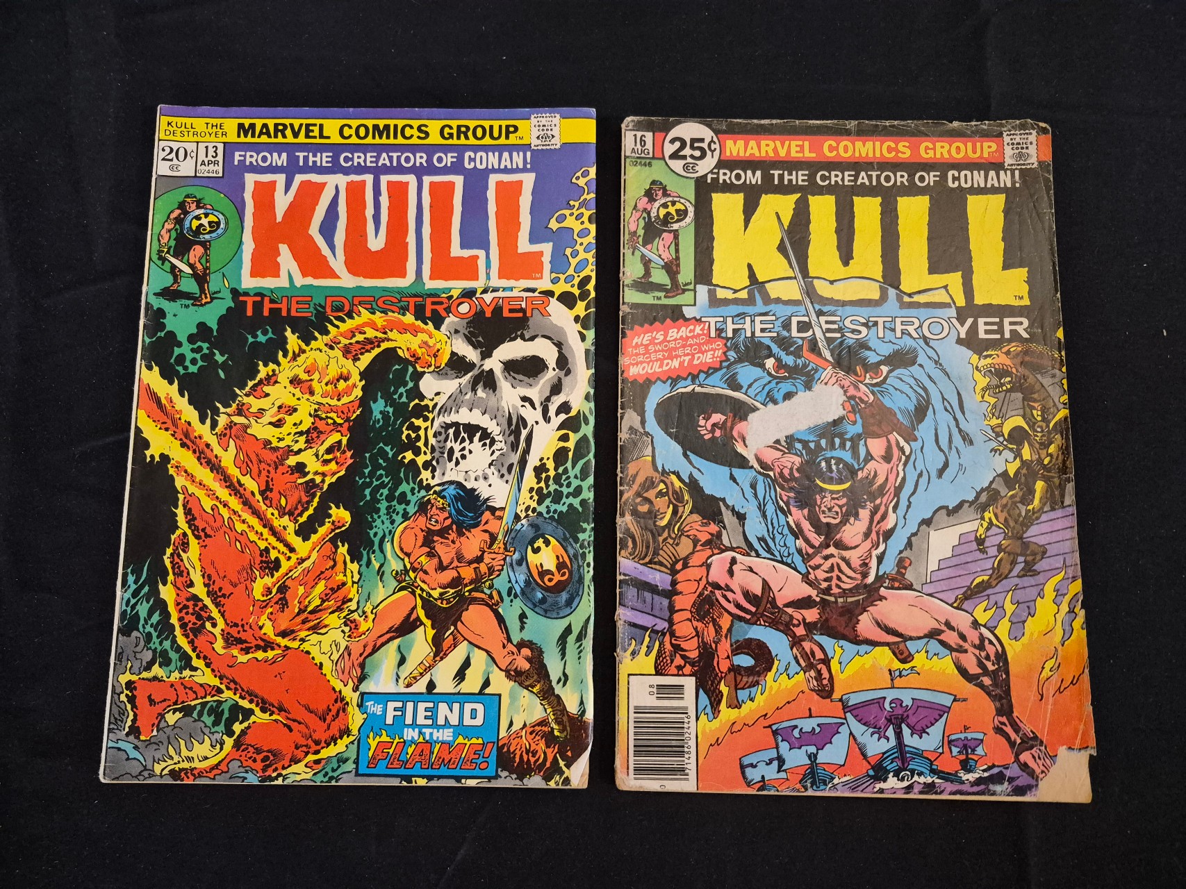 BID PER WHAT YOU SEE IN THE PHOTO, NOT THE AI GENERATED TITLES AND DESCRIPTIONS! A pair of Bronze Age comic books from the Marvel Comics Group featuring the character Kull the Destroyer, based on the works of Robert E. Howard. The lot includes issue number 13, dated April with a 20-cent cover price, and issue number 16, dated August with a 25-cent cover price. Both issues feature the tagline From the creator of Conan! and stylized cover art. Issue 13 illustrates Kull facing The Fiend in the Flame!. Issue 16 features a UPC barcode on the lower left of the cover. These are staple-bound newsprint publications with color-printed covers.