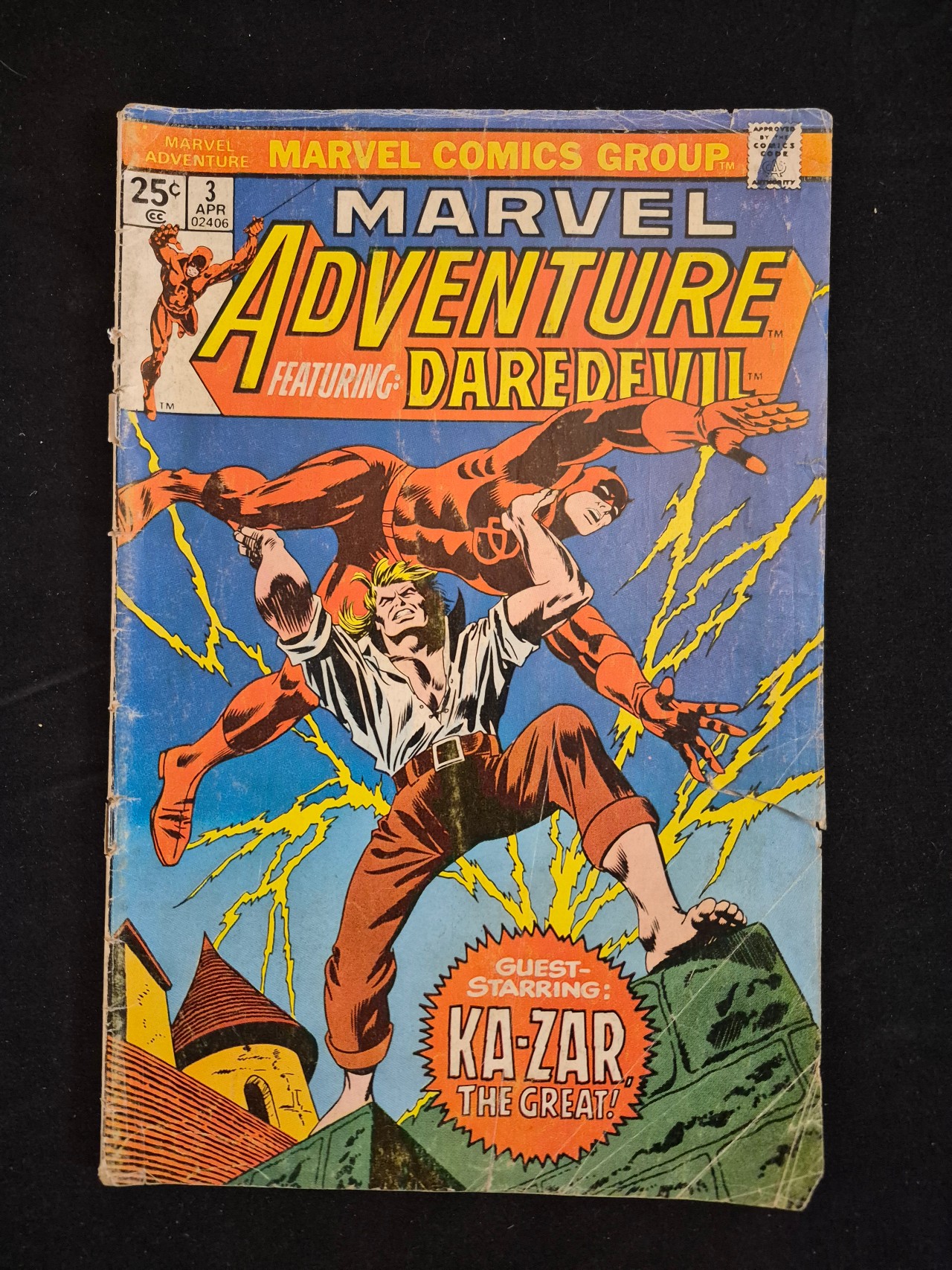 BID PER WHAT YOU SEE IN THE PHOTO, NOT THE AI GENERATED TITLES AND DESCRIPTIONS! This single issue comic book, titled Marvel Adventure Featuring Daredevil, issue number 3, was published by the Marvel Comics Group in April 1976. The cover displays a 25 cent price point and the Comics Code Authority seal in the upper right corner. The cover illustration depicts the character Ka-Zar holding Daredevil aloft against a backdrop of yellow lightning and castle turrets, with text stating Guest-Starring: Ka-Zar The Great!.
