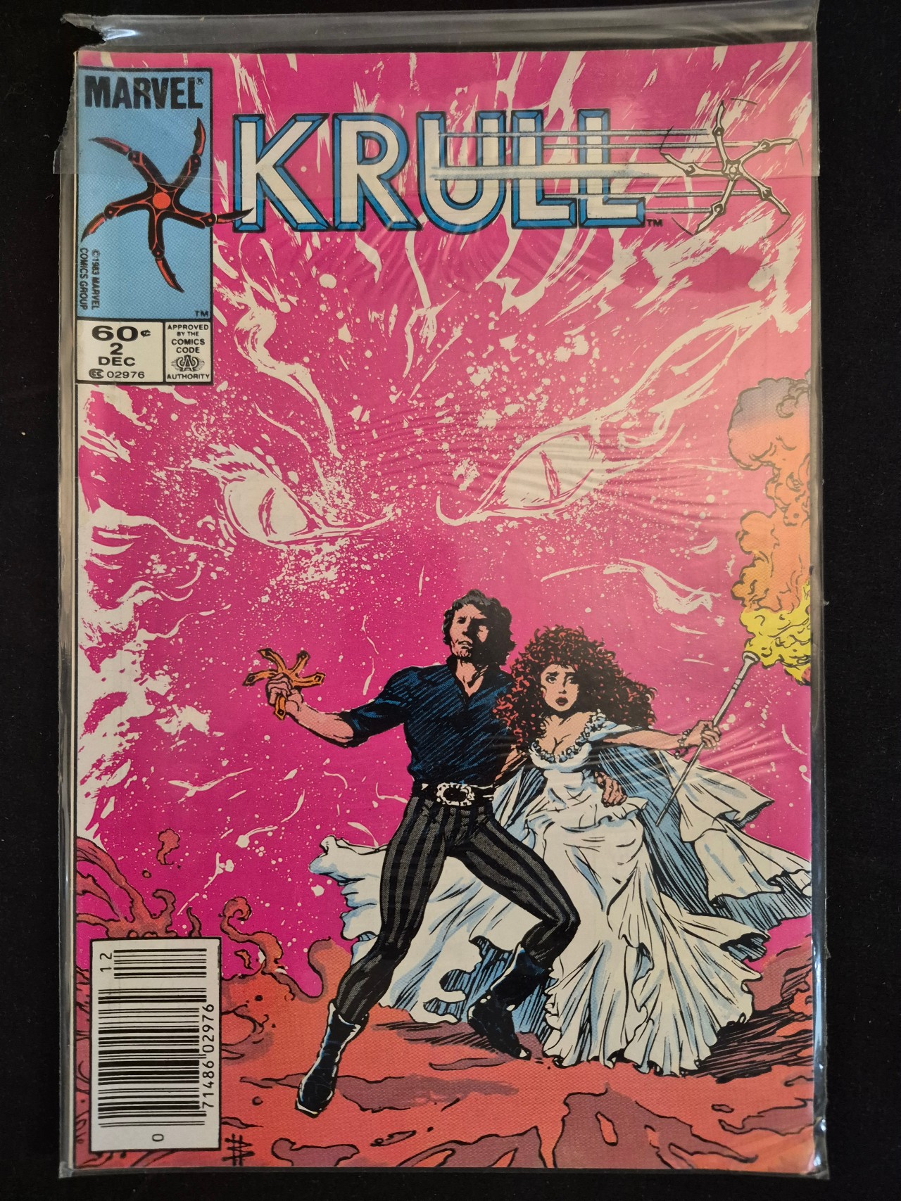 BID PER WHAT YOU SEE IN THE PHOTO, NOT THE AI GENERATED TITLES AND DESCRIPTIONS! A single issue of the Marvel Comics series Krull, issue number 2, published in December 1983. The cover features a pink background with white energy swirls forming a large face. The foreground depicts a male character brandishing a Glaive and a female character in a white dress holding a torch. The trade dress includes the Marvel Comics Group logo, the series title Krull in a stylized blue font, a 60-cent price mark, the Comics Code Authority seal, and a barcode in the lower-left corner. The comic is housed in a clear plastic protective sleeve.