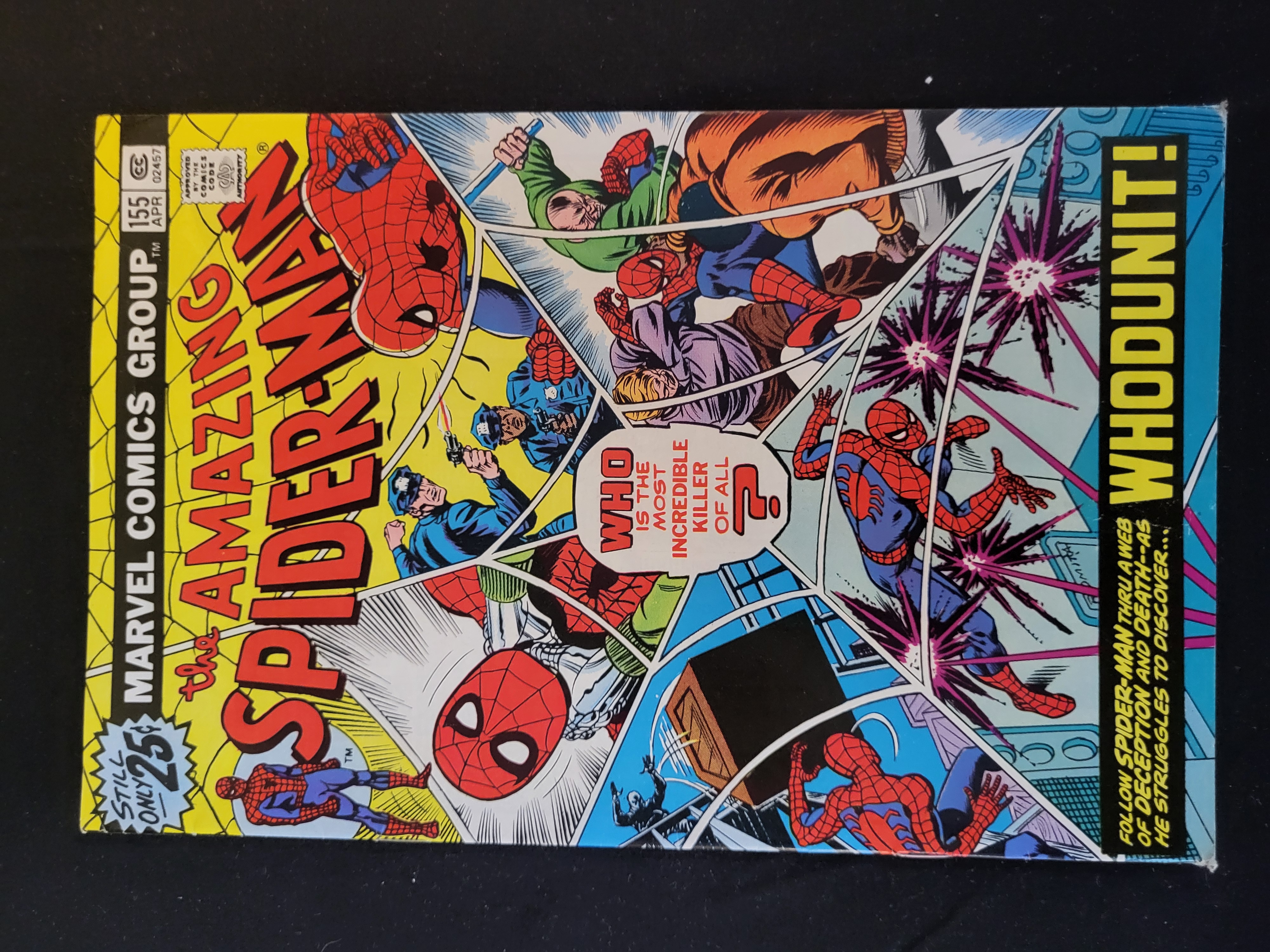BID PER WHAT YOU SEE IN THE PHOTO, NOT THE AI GENERATED TITLES AND DESCRIPTIONS! The Amazing Spider-Man issue number 155 published by the Marvel Comics Group in April 1976. This vintage comic book features a multi-panel cover illustration depicting Spider-Man in various action scenes with the text WHODUNIT and WHO IS THE MOST INCREDIBLE KILLER OF ALL. The front cover includes the Marvel Comics Group header, a 25 cent price point, and the Comics Code Authority seal. The publication is part of the series established in 1963.