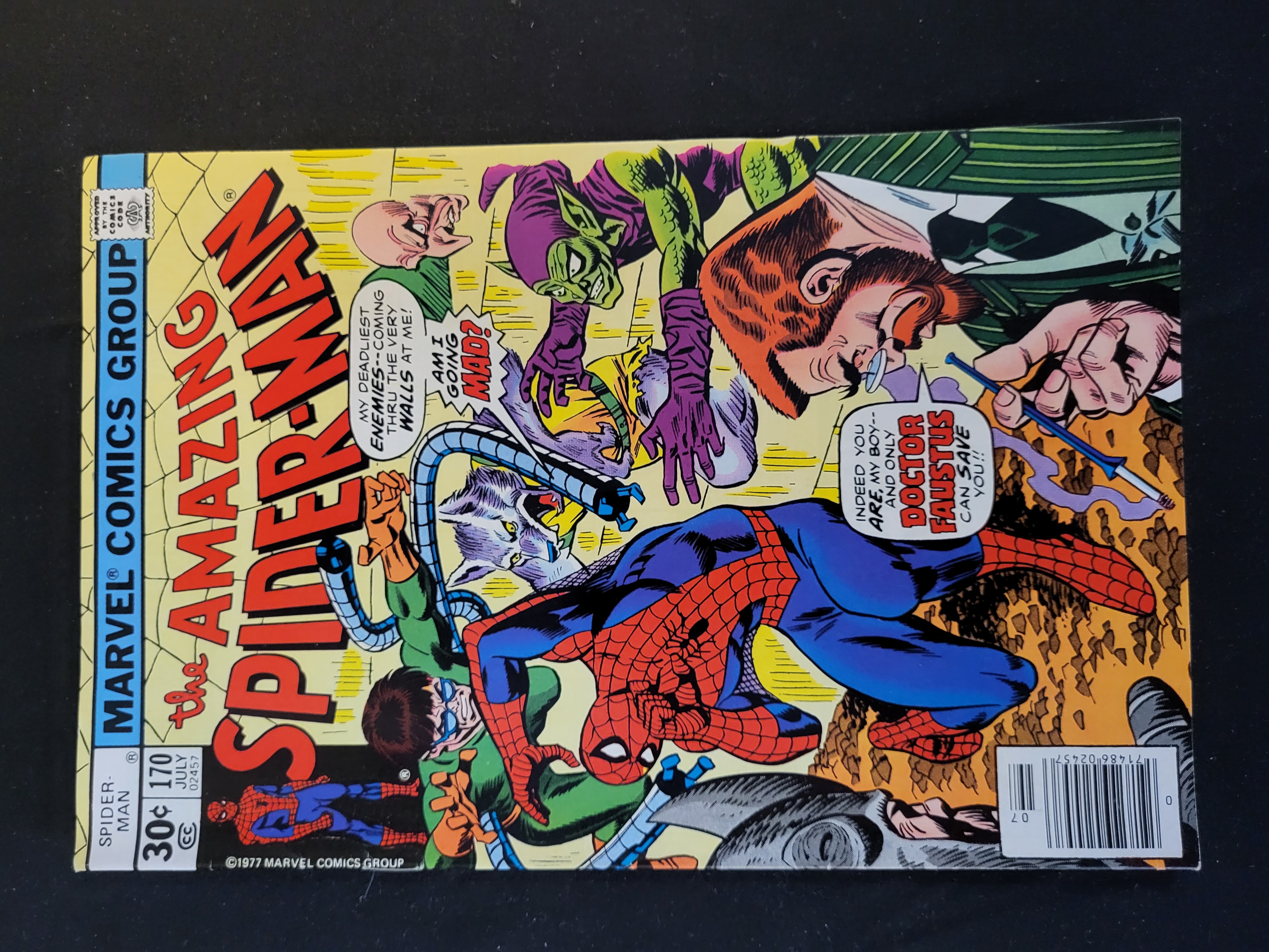 BID PER WHAT YOU SEE IN THE PHOTO, NOT THE AI GENERATED TITLES AND DESCRIPTIONS! This vintage comic book is an issue of The Amazing Spider-Man, number 170, published by Marvel Comics Group and dated July 1977. The cover art features Spider-Man in a central position, surrounded by various adversaries including the Green Goblin and Doctor Octopus, with dialogue text mentioning Doctor Faustus. The cover includes the original 30 cent price point, the Marvel Comics Group branding, and the Approved by the Comics Code Authority seal. A copyright date of 1977 is visible at the bottom of the cover. The front features a standard UPC barcode in the lower right corner.