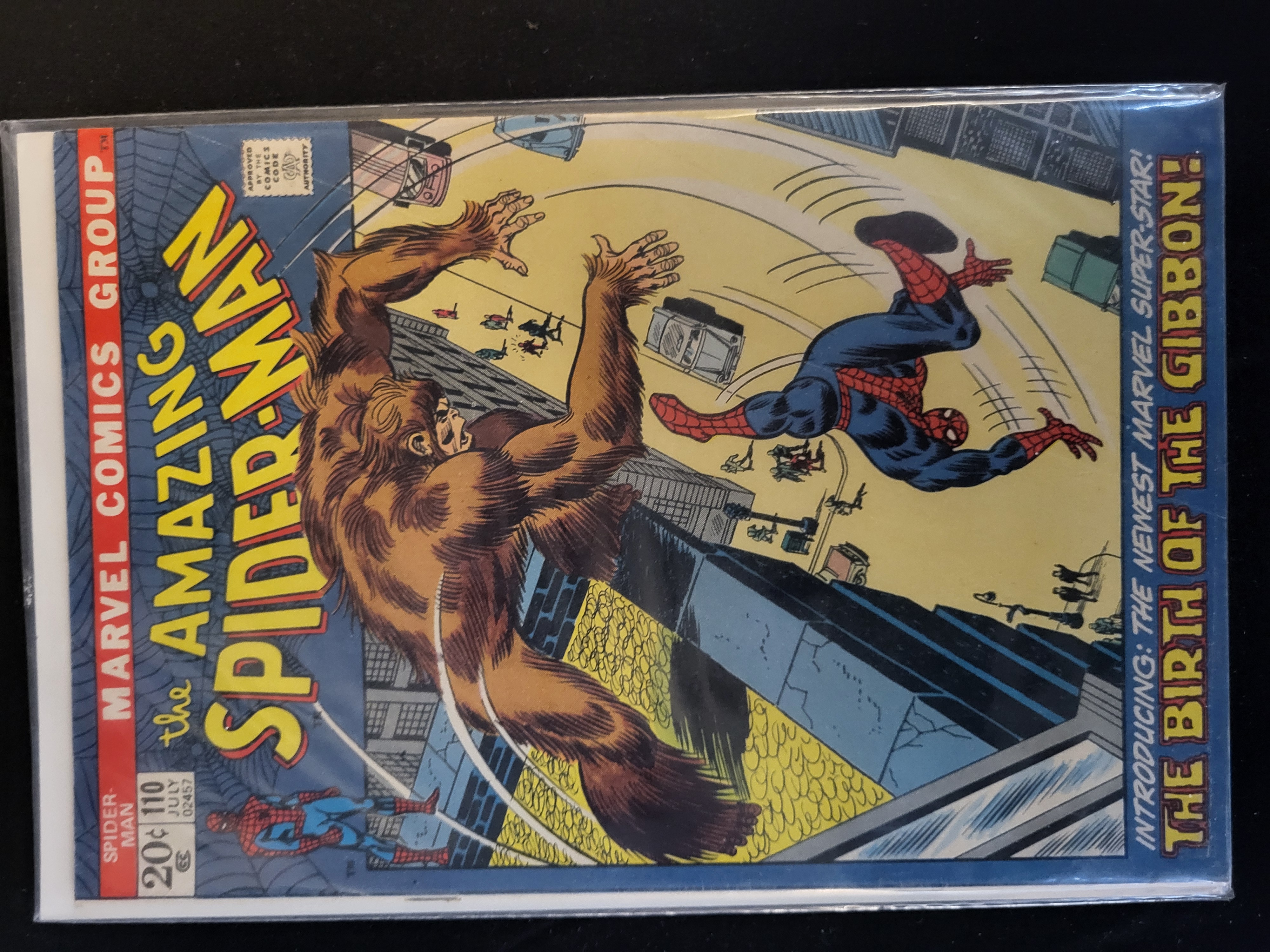 BID PER WHAT YOU SEE IN THE PHOTO, NOT THE AI GENERATED TITLES AND DESCRIPTIONS! A copy of The Amazing Spider-Man issue number 110, published by the Marvel Comics Group with a cover date of July 1972. This Bronze Age comic book features the first appearance of the Gibbon and includes an appearance by Kraven the Hunter. The front cover art depicts Spider-Man in combat with the Gibbon and includes the text Introducing: The Newest Marvel Super-Star! The Birth of the Gibbon!. Markings on the cover include the 20 cent price, the issue number, and the Comics Code Authority seal. The item is housed in a clear plastic protective sleeve with a cardboard backing.