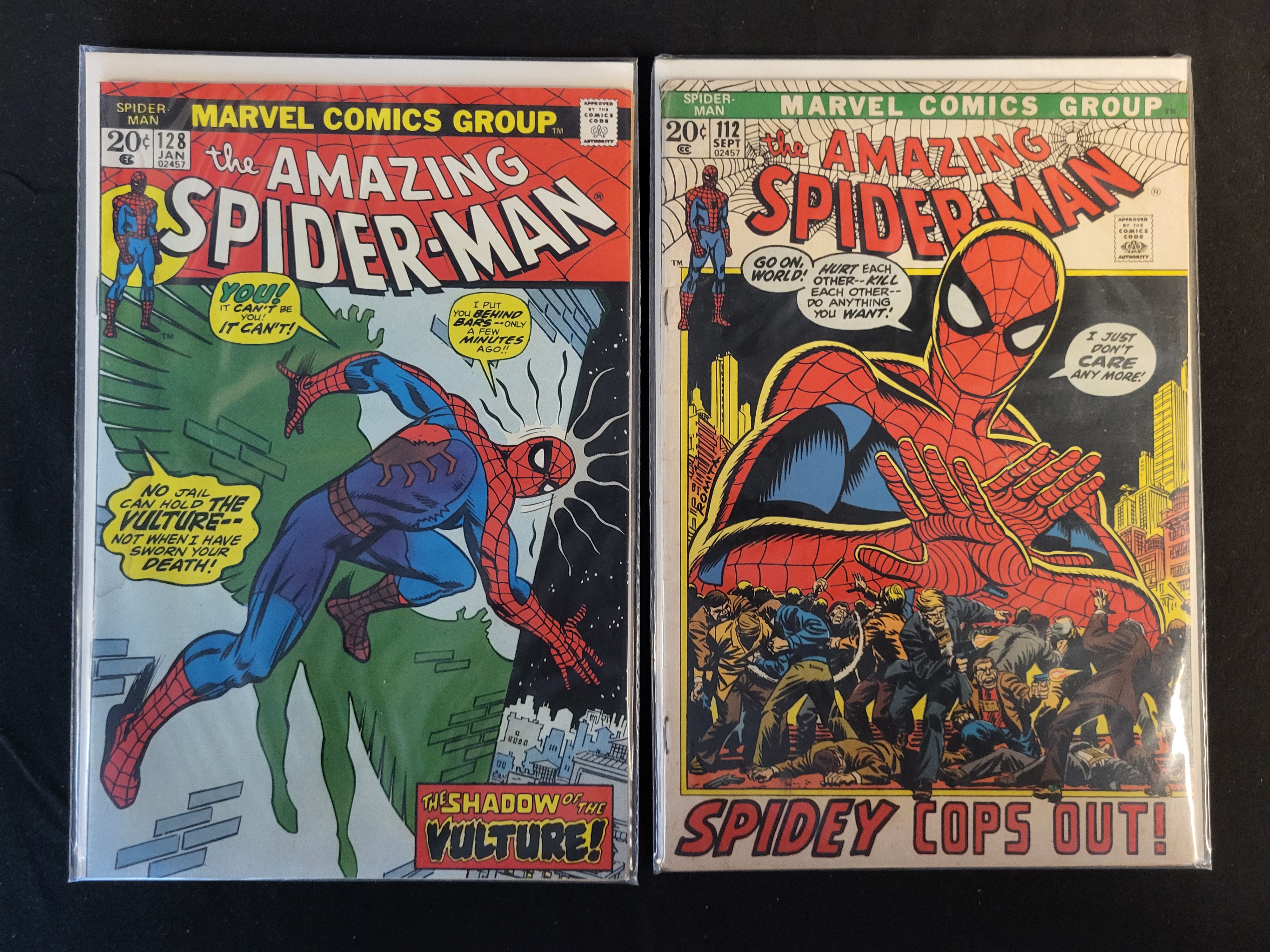 BID PER WHAT YOU SEE IN THE PHOTO, NOT THE AI GENERATED TITLES AND DESCRIPTIONS! A pair of vintage Marvel Comics Group comic books from The Amazing Spider-Man series. The lot includes issue number 112, dated September 1972, titled Spidey Cops Out!, and issue number 128, dated January 1974, titled The Shadow of the Vulture!. Both publications feature a 20-cent cover price and the Comics Code Authority seal. Issue 128 features cover art by John Romita Sr. and depicts the characters Spider-Man and the Vulture. Issue 112 features a central graphic of Spider-Man above a street scene. The comics are printed on newsprint with color covers and are housed in individual clear plastic protective sleeves with white backing boards.