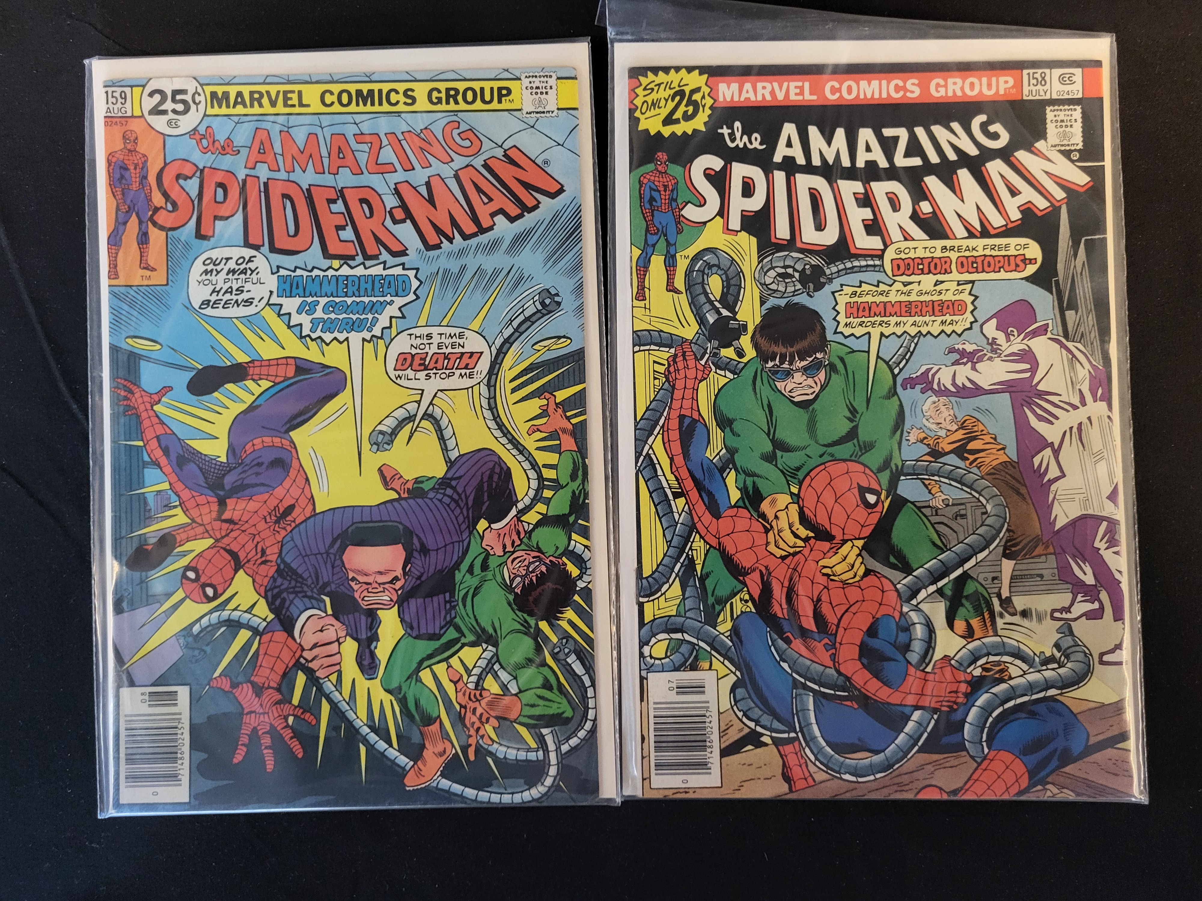 BID PER WHAT YOU SEE IN THE PHOTO, NOT THE AI GENERATED TITLES AND DESCRIPTIONS! A pair of vintage Bronze Age comic books from the Marvel Comics Group featuring The Amazing Spider-Man. The lot includes issue number 158, published July 1976, and issue number 159, published August 1976. Both issues feature a 25-cent cover price and include the Comics Code Authority seal. Issue 158 features cover art by Ross Andru depicting Spider-Man, Doctor Octopus, and Hammerhead. Issue 159 continues the storyline featuring Hammerhead and Doctor Octopus. Both publications include a printed UPC barcode in the lower-left corner of the front cover. The comic books are housed in protective plastic sleeves with white backing boards.
