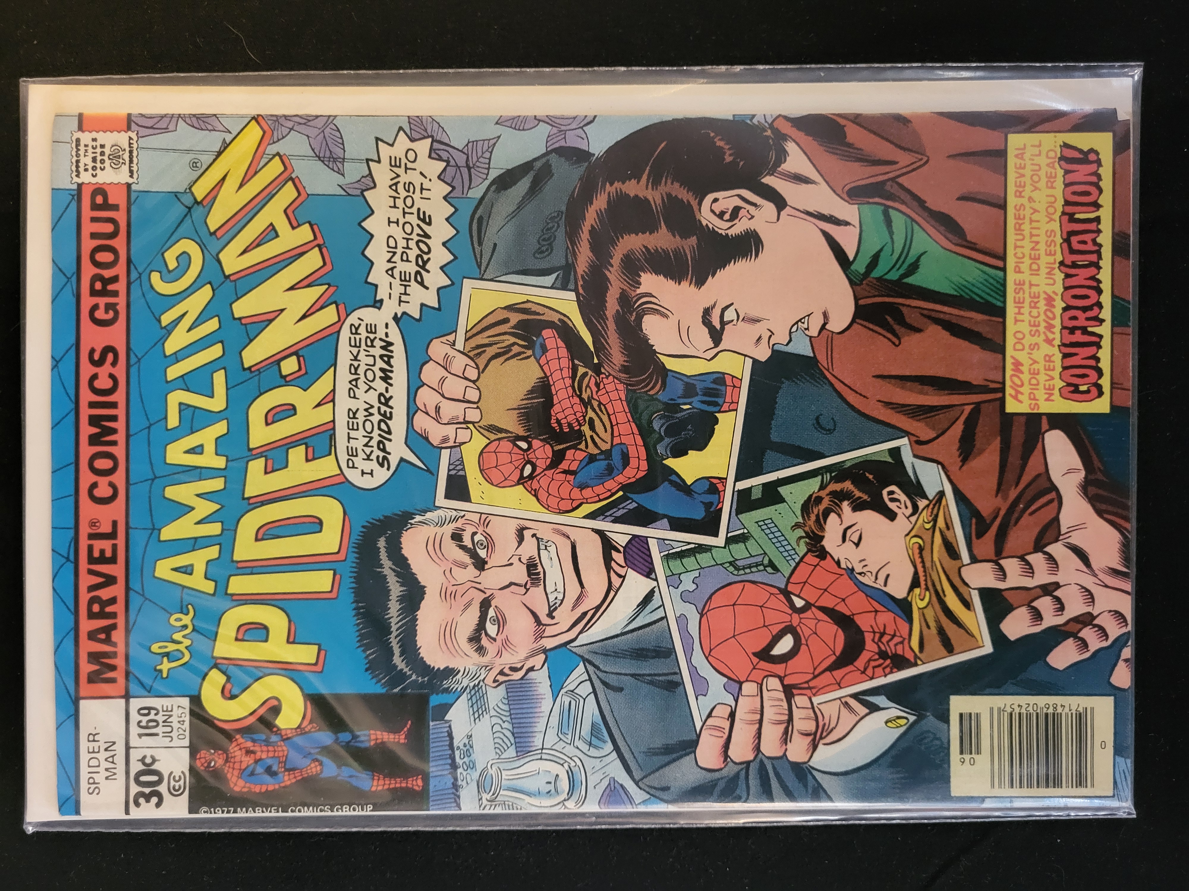 BID PER WHAT YOU SEE IN THE PHOTO, NOT THE AI GENERATED TITLES AND DESCRIPTIONS! This is a copy of The Amazing Spider-Man issue number 169, published by Marvel Comics Group in June 1977. The Bronze Age comic book features a cover illustration titled Confrontation, depicting J. Jonah Jameson presenting photographic evidence of Peter Parker’s secret identity. The front cover includes the Marvel Comics Group masthead, a 30-cent price point, the Comics Code Authority seal, and a newsstand barcode in the lower right corner. The publication is a standard format comic book printed on period paper stock.
