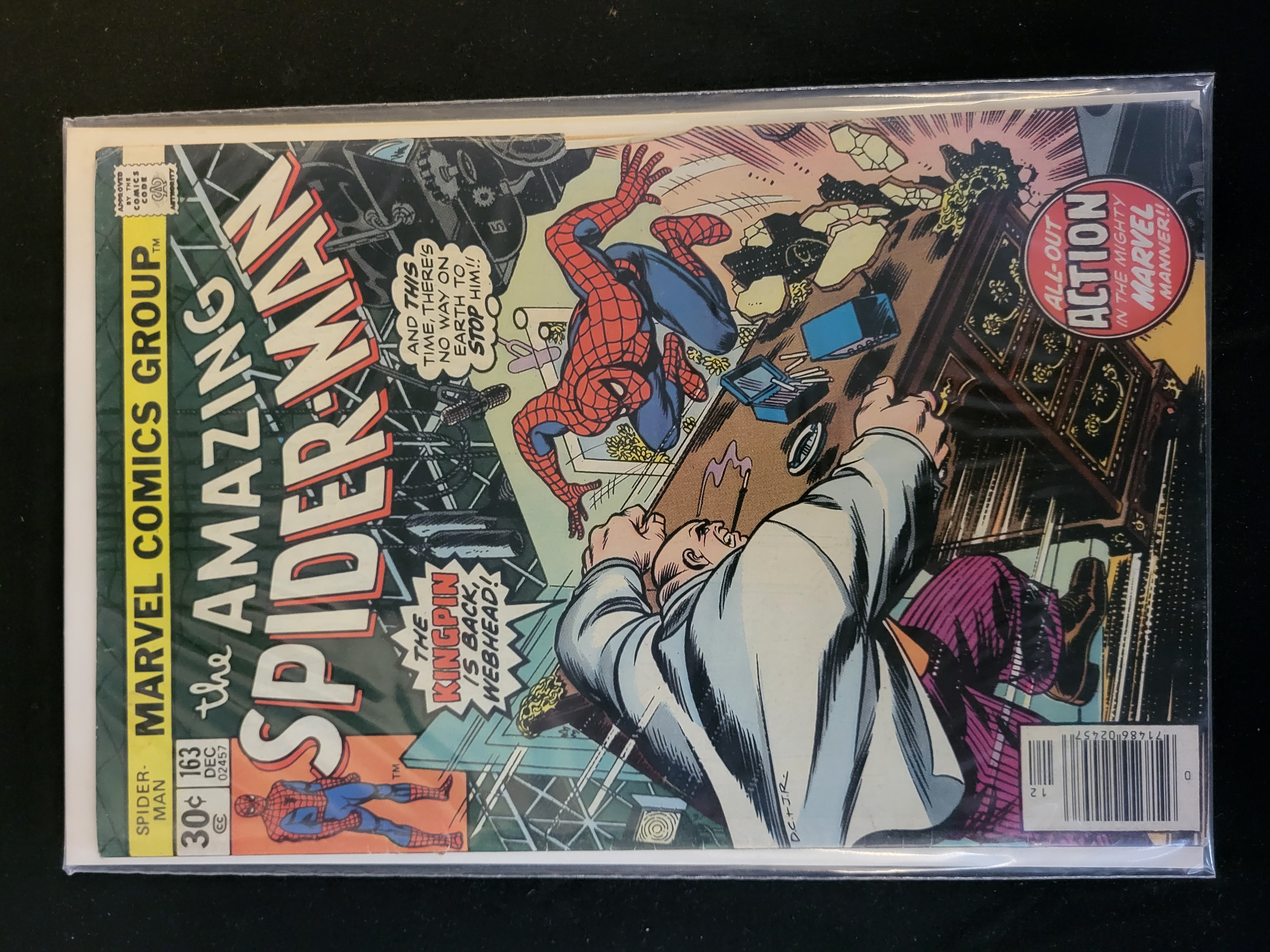 BID PER WHAT YOU SEE IN THE PHOTO, NOT THE AI GENERATED TITLES AND DESCRIPTIONS! The Amazing Spider-Man issue number 163, published by Marvel Comics Group and dated December 1976. This comic book features a cover illustration by Dave Cockrum and John Romita Sr., as indicated by the DC+JR signature, depicting Spider-Man in combat with the Kingpin. The cover displays a 30 cent price point and the Marvel Comics Group banner along the left edge. The item is presented in a clear protective sleeve with a white cardstock backing board.
