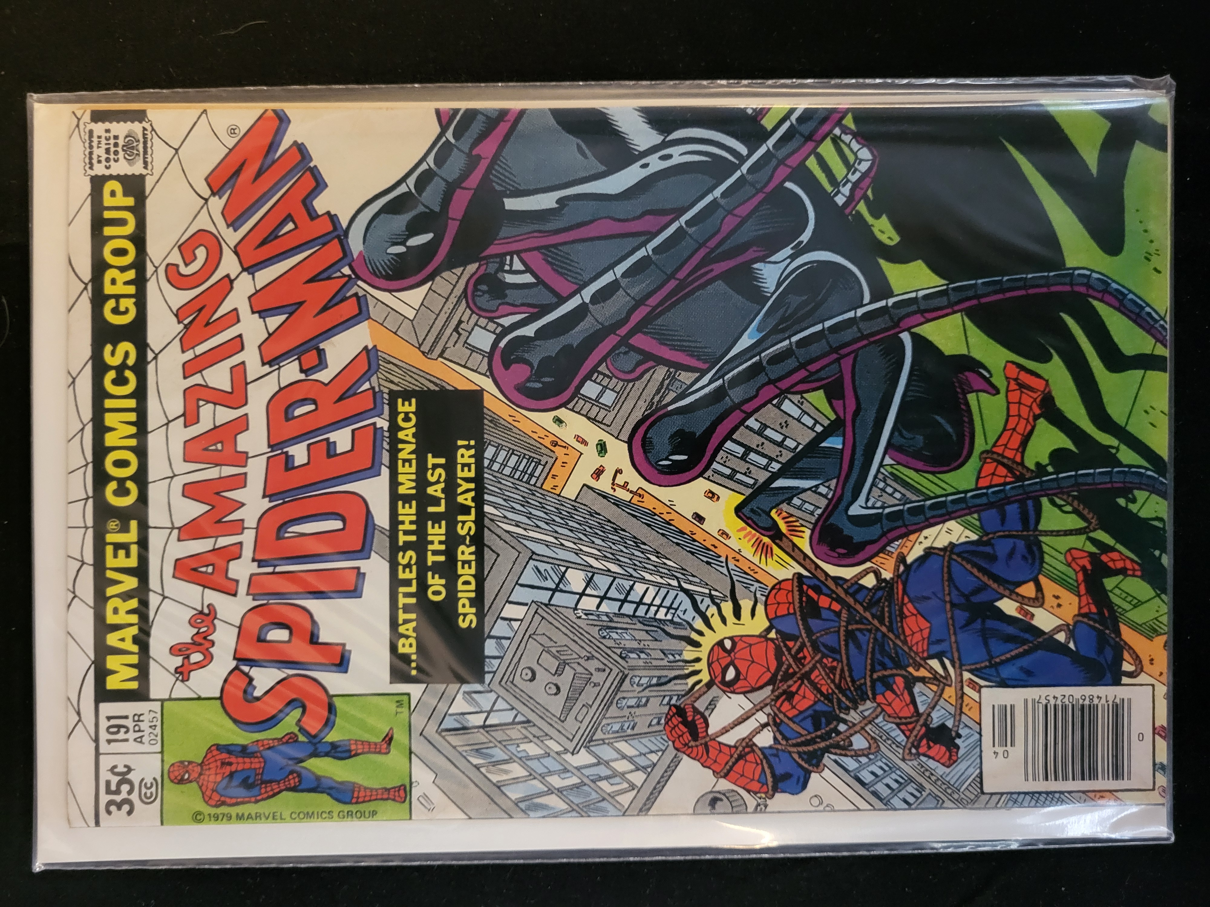 BID PER WHAT YOU SEE IN THE PHOTO, NOT THE AI GENERATED TITLES AND DESCRIPTIONS! A Marvel Comics Group publication titled The Amazing Spider-Man issue number 191, dated April 1979. This Bronze Age comic book features a cover price of 35 cents. The front cover art depicts Spider-Man ensnared by mechanical tentacles with the descriptive text Battles the Menace of the Last Spider-Slayer. The cover includes standard Marvel Comics Group trade dress, the Comics Code Authority seal, and a UPC barcode. The item is presented in a protective plastic sleeve with a backing board.