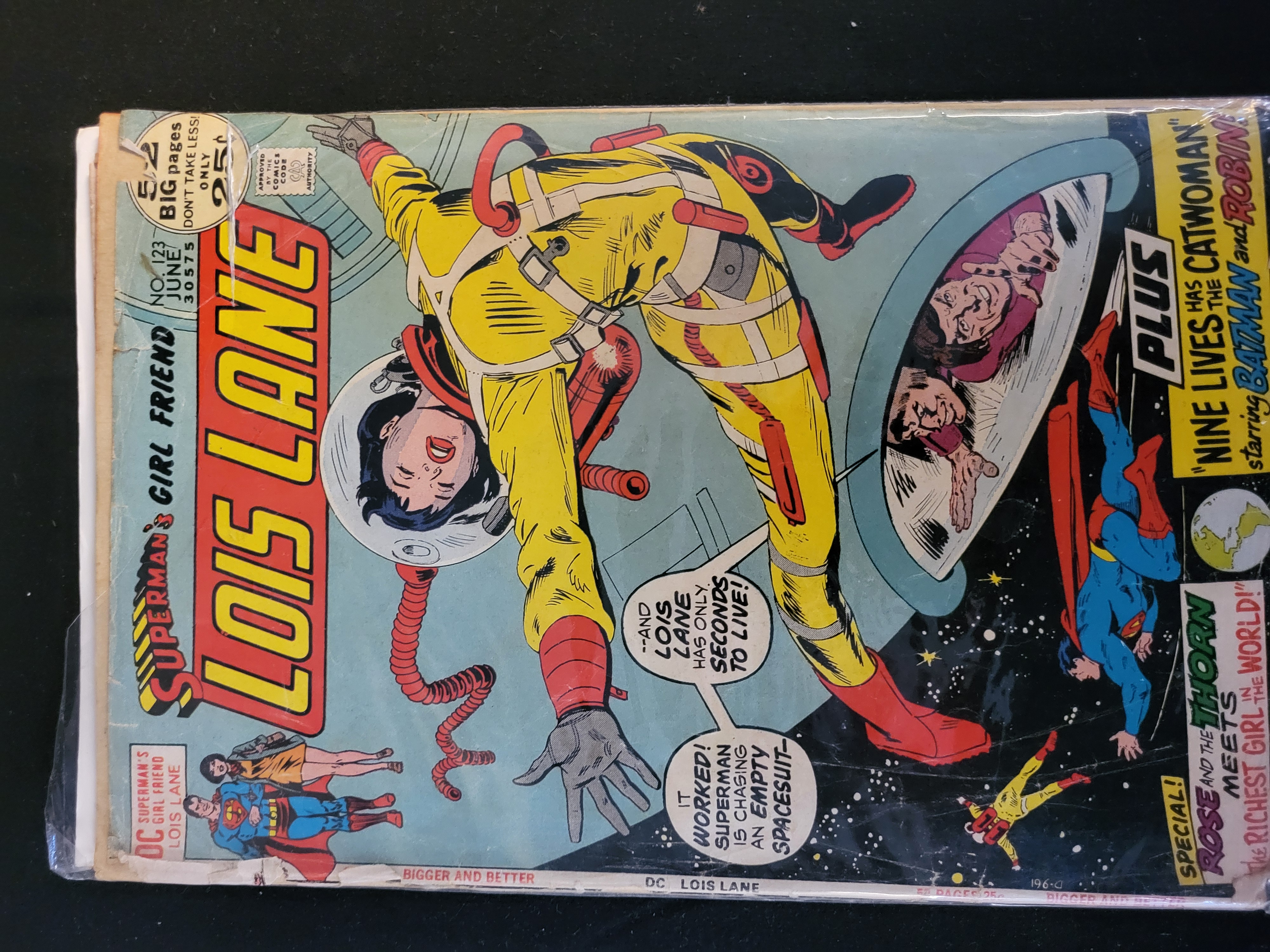 BID PER WHAT YOU SEE IN THE PHOTO, NOT THE AI GENERATED TITLES AND DESCRIPTIONS! This is a single issue of the DC comic book Superman’s Girl Friend Lois Lane, No. 123, published in June 1972. The cover art depicts Lois Lane in a yellow spacesuit adrift in space. The issue is identified as a Bronze Age publication containing 52 pages. Featured content includes a story titled Nine Lives Has Catwoman starring Batman and Robin, as well as a Rose and Thorn story. The front cover displays a 25-cent price point and the Comics Code Authority seal. The item is housed in a protective plastic sleeve.