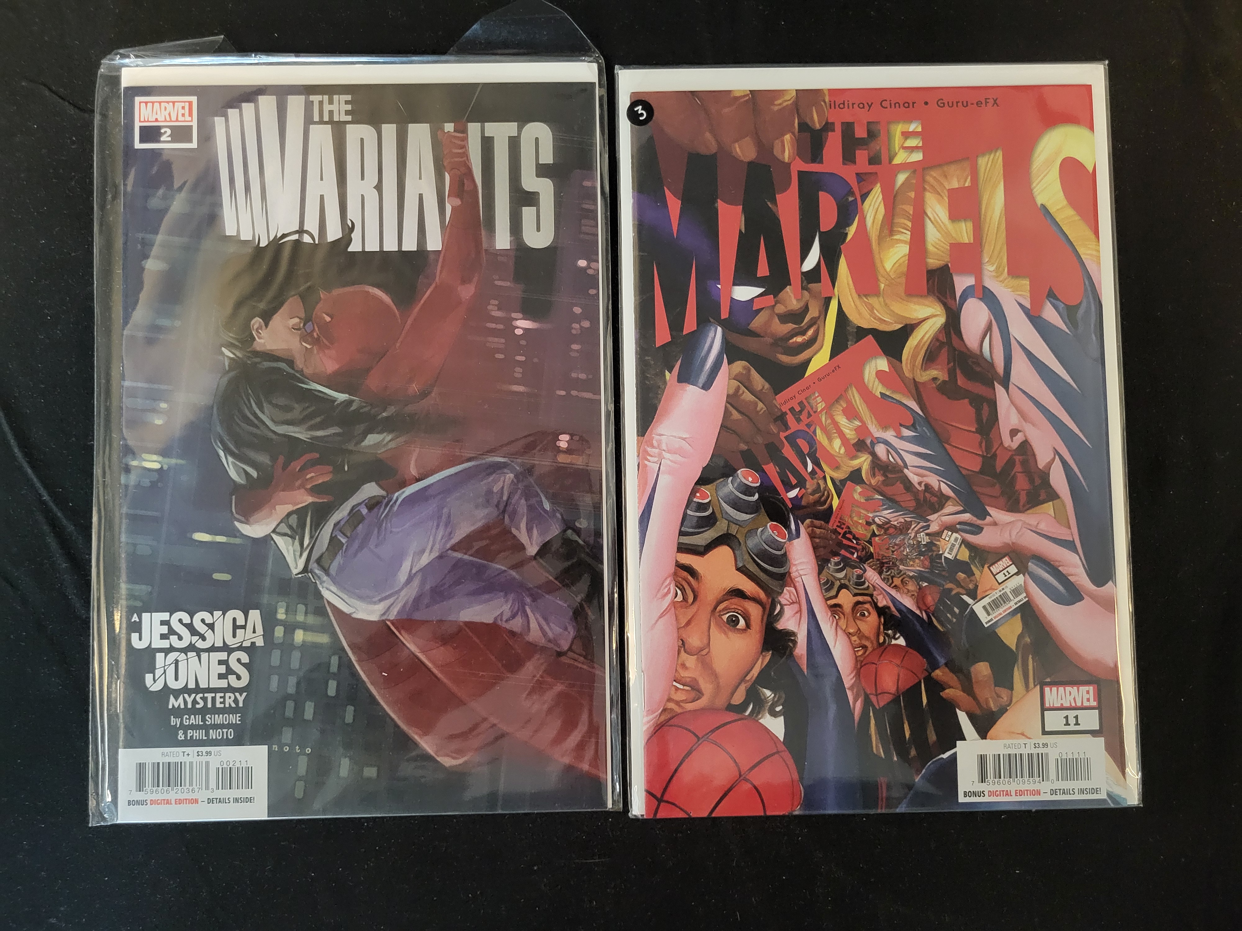 BID PER WHAT YOU SEE IN THE PHOTO, NOT THE AI GENERATED TITLES AND DESCRIPTIONS! A pair of modern-era Marvel comic books. The first issue is The Marvels #11, published in 2022, written by Kurt Busiek with cover art credited to Yildiray Cinar and Guru-eFX. The cover features a collage-style illustration of multiple characters. The second issue is The Variants #2, subtitled A Jessica Jones Mystery, written by Gail Simone with art by Phil Noto. The cover depicts characters in an embrace against a city backdrop. Both publications are marked with a $3.99 cover price and a T+ rating. The comics are individually presented in clear protective sleeves with white backing boards.