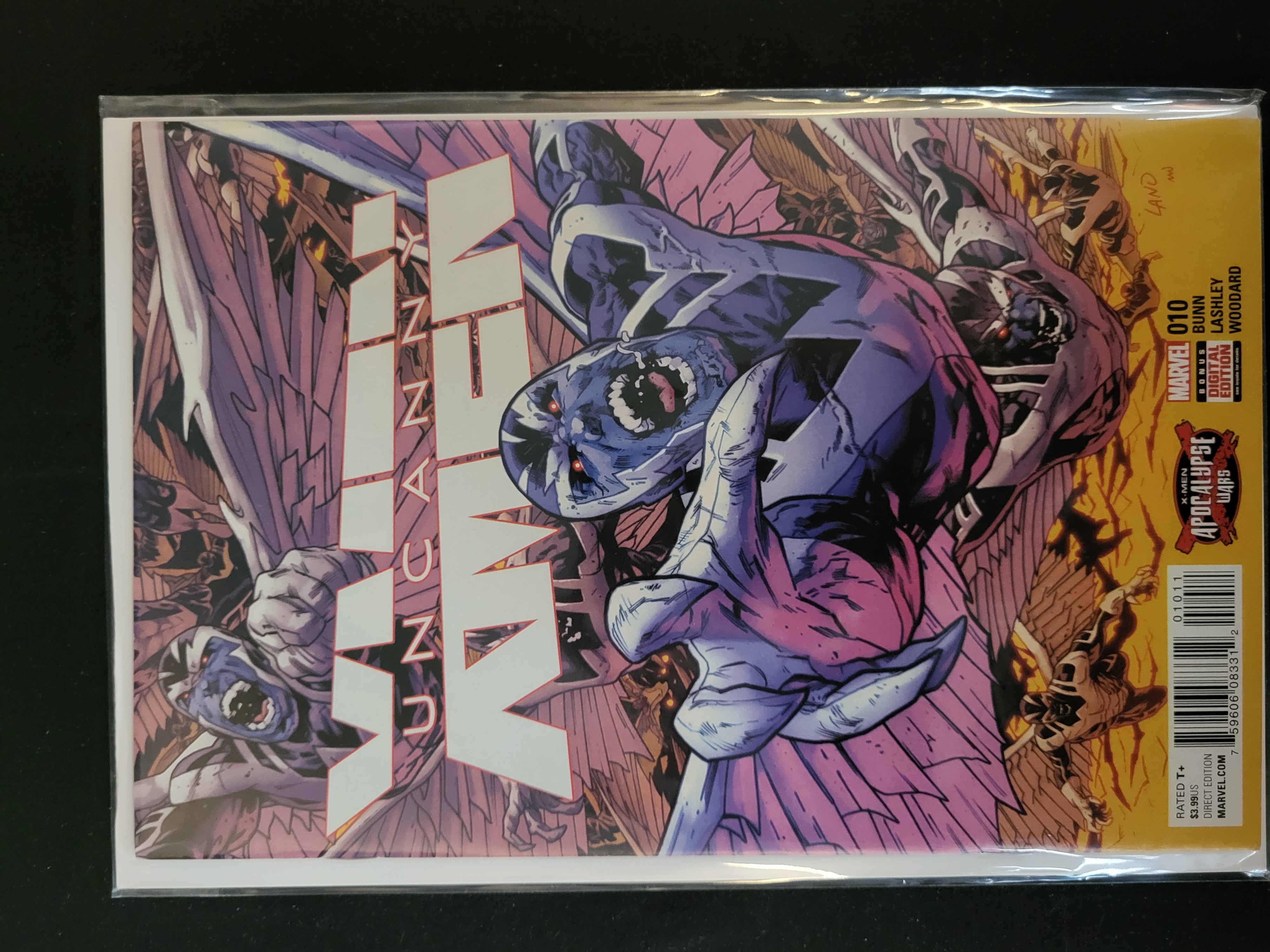 BID PER WHAT YOU SEE IN THE PHOTO, NOT THE AI GENERATED TITLES AND DESCRIPTIONS! A single copy of the Marvel comic book Uncanny X-Men issue 010, part of the Apocalypse Wars storyline. The cover art is signed LAND for artist Greg Land and depicts several Archangel-style characters in a dynamic scene. Printed details on the right margin include the Marvel logo, issue number 010, and creative credits for Cullen Bunn, Ken Lashley, and Nolan Woodard. The cover also features a Bonus Digital Edition label and the Apocalypse Wars event logo. The comic is stored in a protective plastic sleeve with a backing board.