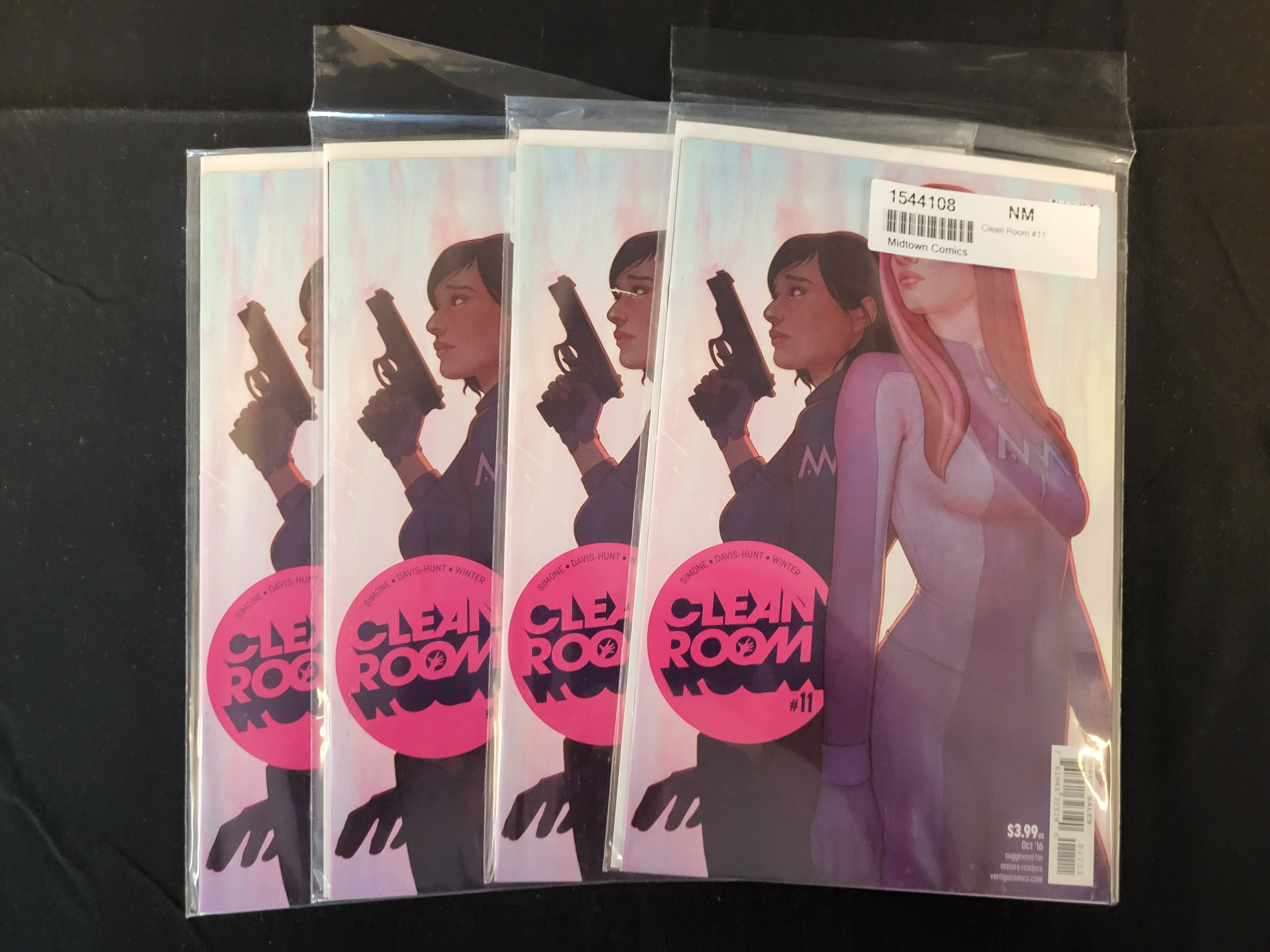 BID PER WHAT YOU SEE IN THE PHOTO, NOT THE AI GENERATED TITLES AND DESCRIPTIONS! A group of comic books from the Vertigo series Clean Room, issue number 11, dated October 2016. The series is written by Gail Simone with cover art credited to Jon Davis-Hunt and Quinton Winter. The cover illustration features two female characters, with one depicted holding a handgun. The publication is explicitly marked as suggested for mature readers. Each comic book is individually preserved within a protective plastic sleeve with a backing board. The foremost issue features a retail label from Midtown Comics.